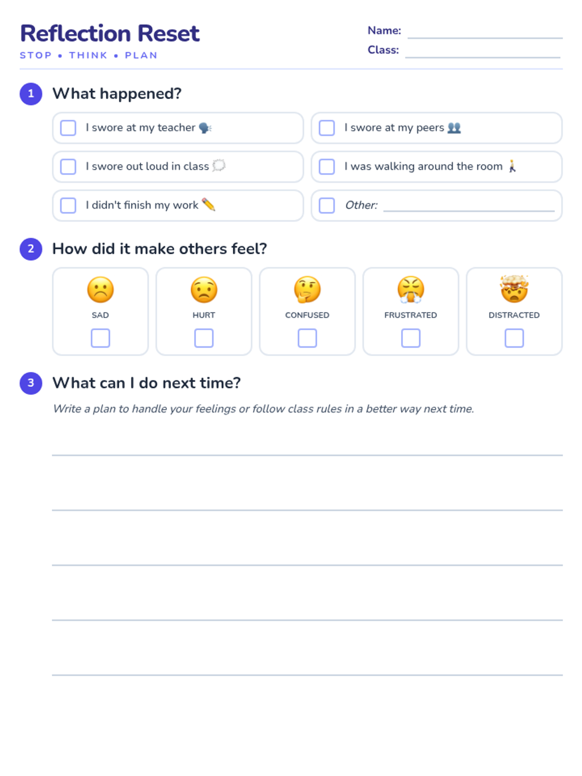 A graphic-organizer style behavior reflection sheet for students. Featuring sections for identifying behavior and impact with visuals, and a large writing area for the student to plan future choices. Removal of multiple choice for goals and student signature as requested. Strictly 1-page design.