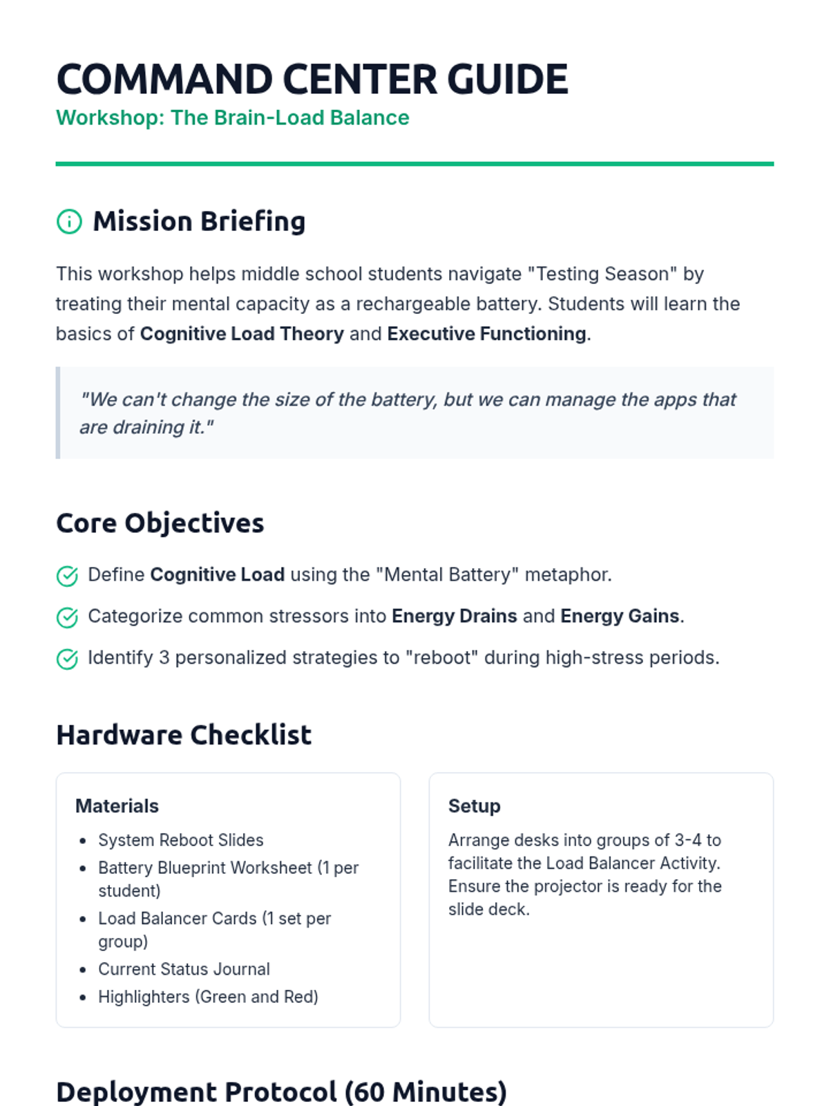 A comprehensive teacher guide for 'The Brain-Load Balance' workshop, including lesson sequence, preparation steps, and differentiation strategies.