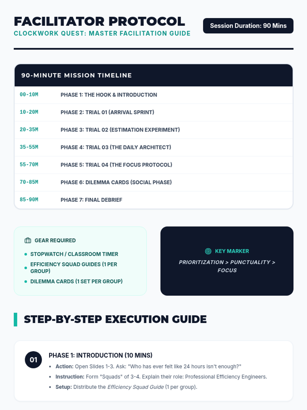 A detailed facilitator guide for the Clockwork Quest workshop. Features a 90-minute agenda and a granular, step-by-step execution guide for every trial, ensuring the teacher knows exactly what to say and do to manage pacing and student engagement. Refined for layout and content clarity.