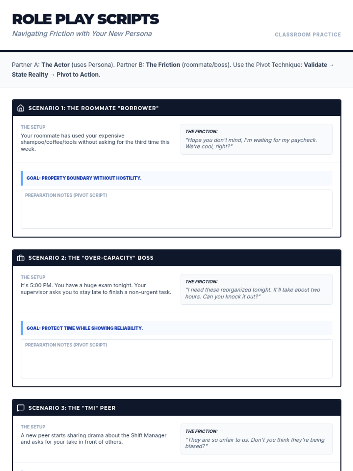A set of role-play scenarios and prompts designed to help students practice maintaining their professional persona while handling difficult interpersonal situations with roommates, supervisors, and peers.