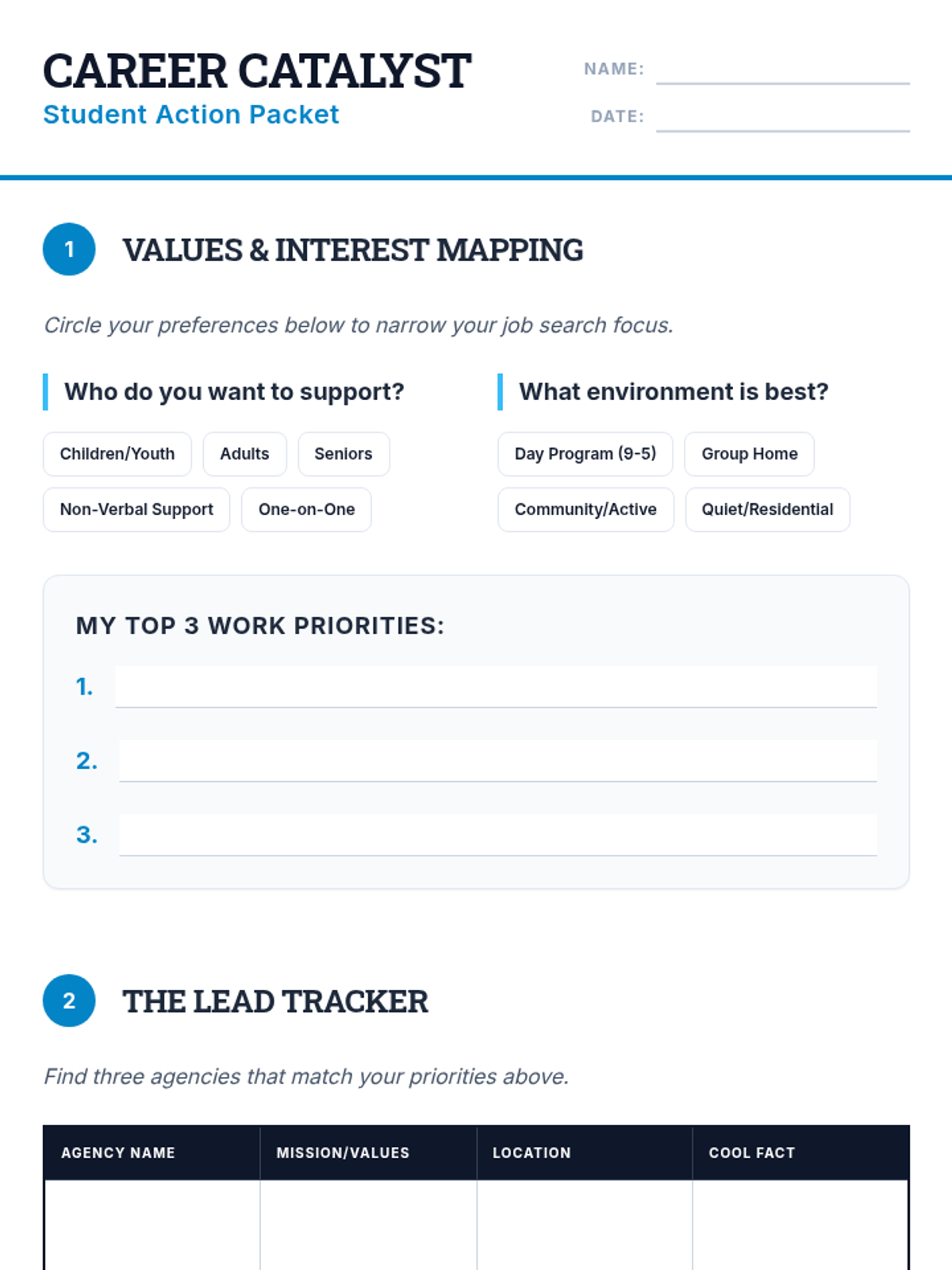 A student-facing activity packet including a values mapping worksheet, a lead tracker table for research, and reflection questions to solidify the ownership mindset. Designed with clear handwriting space and structured guidance.