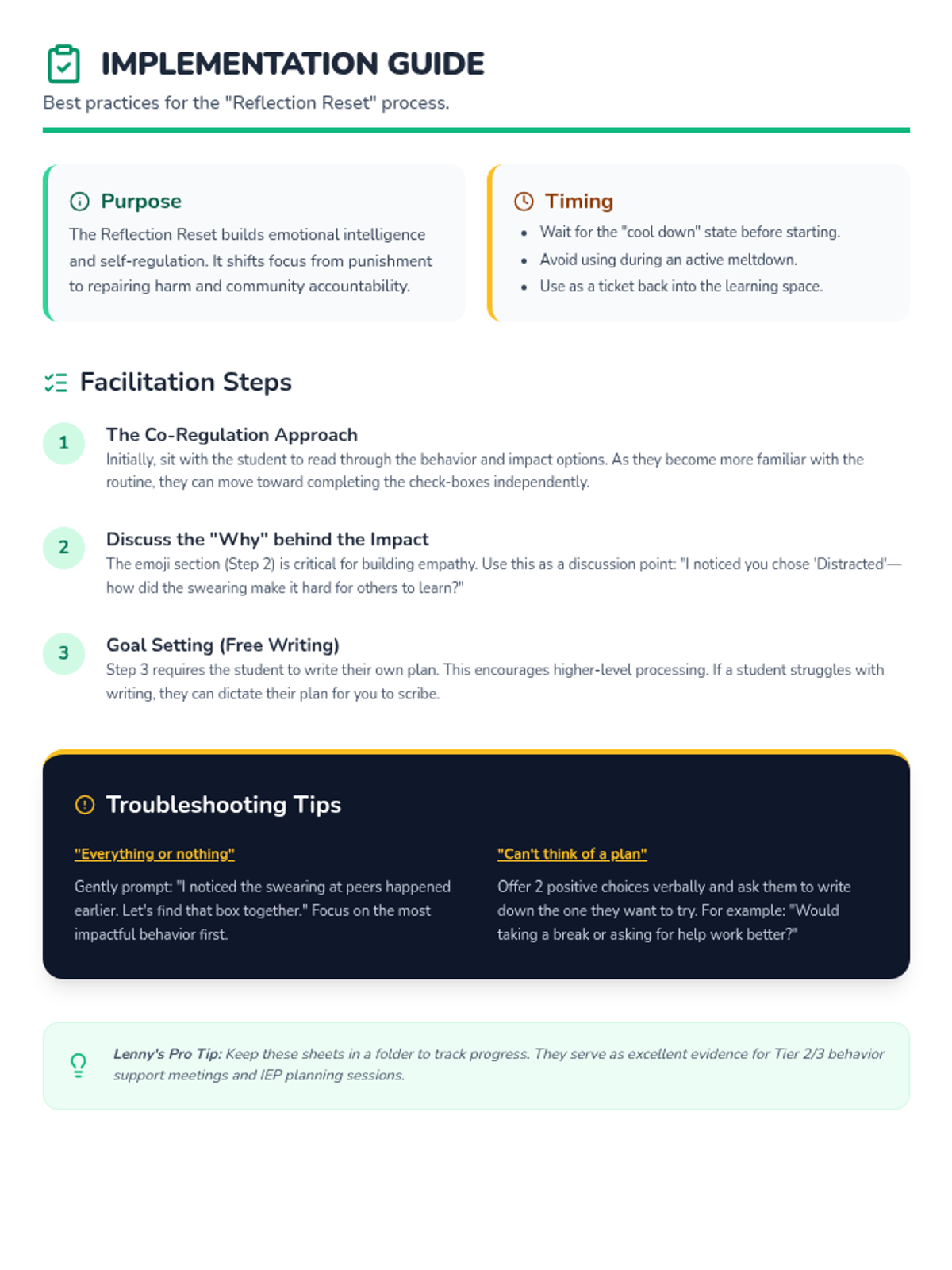 A teacher implementation guide for using the Reflection Reset sheet, revised to focus on the free-writing goal section and removing references to student signatures. Strictly 1-page design.