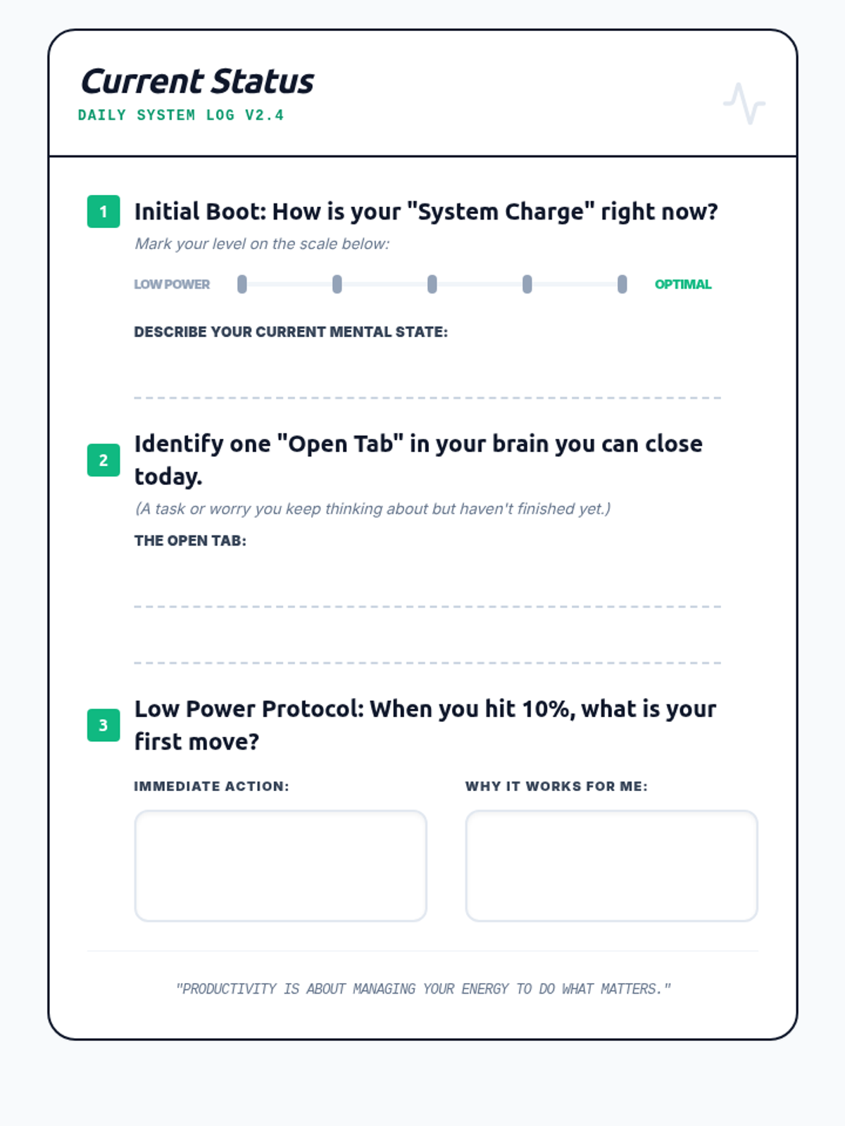 A reflective journal page for students to log mental energy levels. Revised for single-page layout and improved instructional clarity.