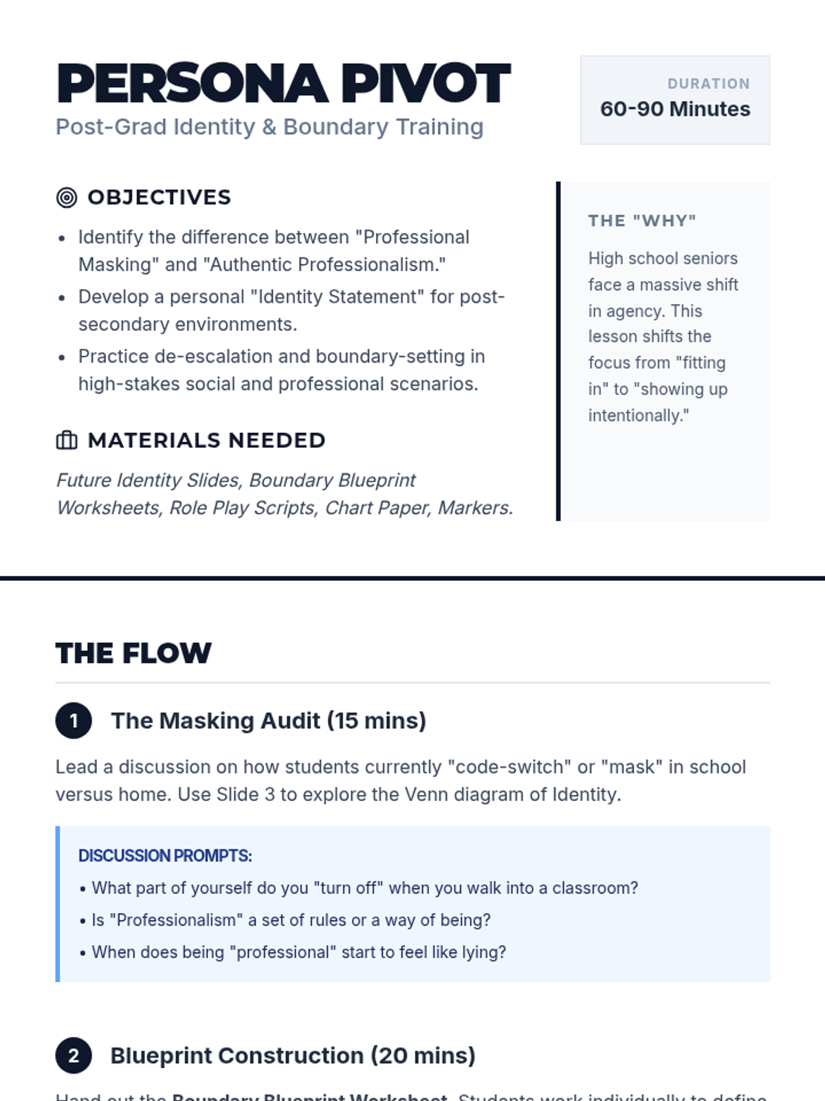 A comprehensive teacher's guide for the Persona Pivot lesson, featuring instructional phases, discussion prompts, and quick-reference scripts for classroom facilitation.