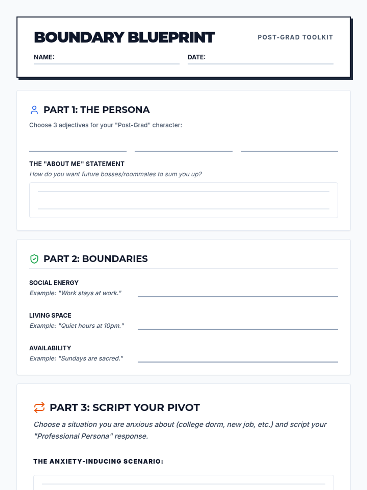 A student-facing worksheet for the Persona Pivot lesson, guiding high schoolers through defining their professional persona, identifying non-negotiable boundaries, and practicing the 'pivot' communication technique.