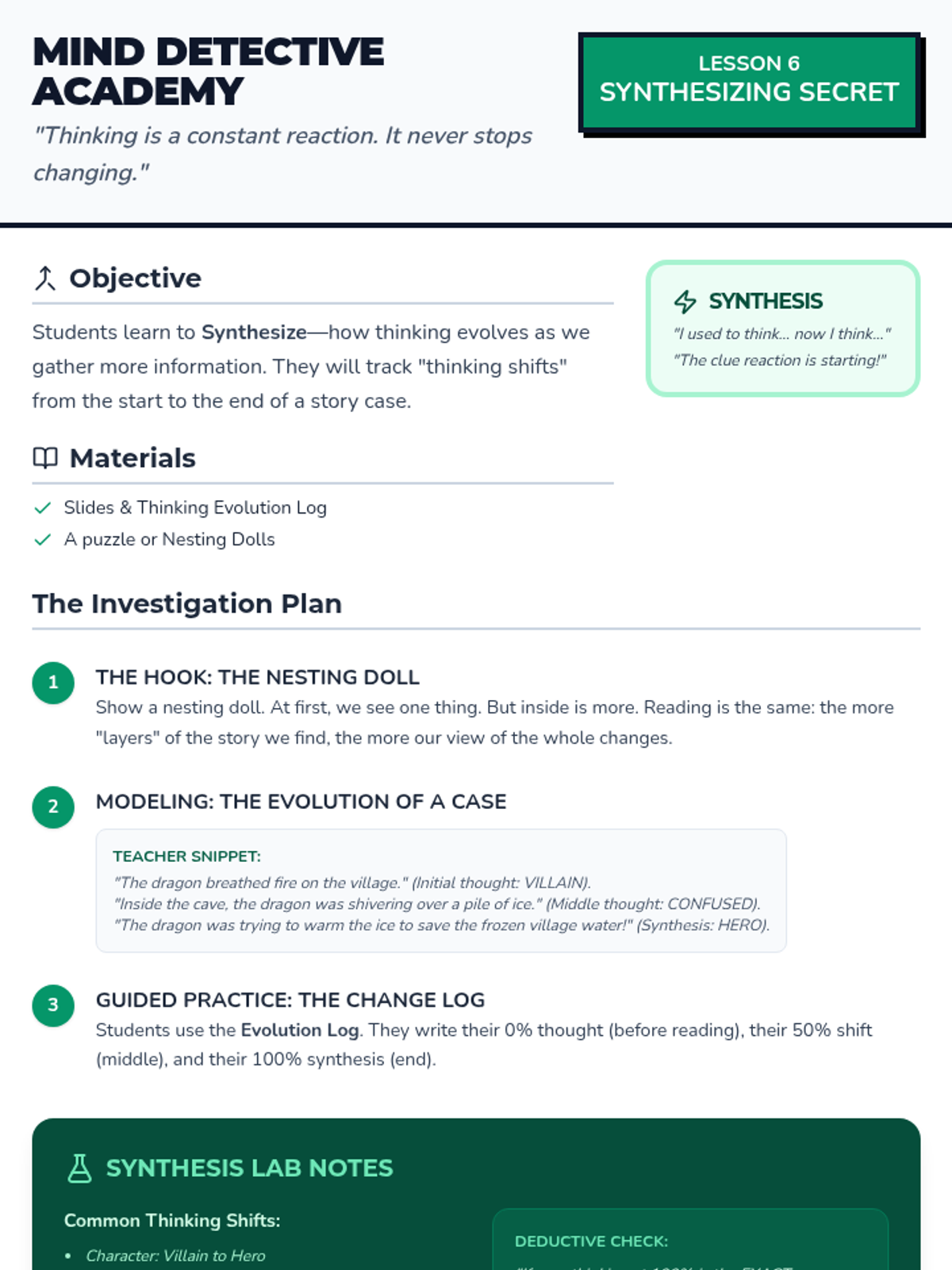 A comprehensive facilitator guide for the 'Reading Craft Service', focusing on metacognitive skills, patterns, and reasoning. Includes a structured 'Before, During, After' framework for all 12 lessons with key text excerpts for grades 4-5. Fixed grading, grade levels, and inconsistencies. Darker excerpt text for legibility.