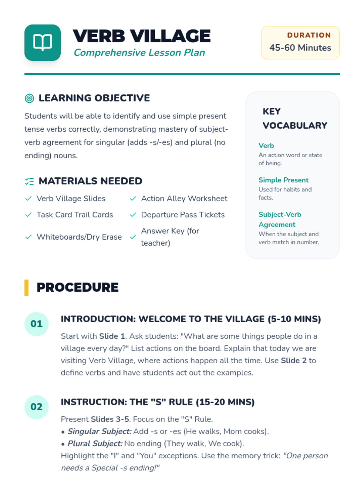 A comprehensive teacher's lesson plan for the Verb Village unit. Outlines objectives, materials, and a step-by-step procedure including introduction, instruction, guided practice, independent work, and assessment strategies.