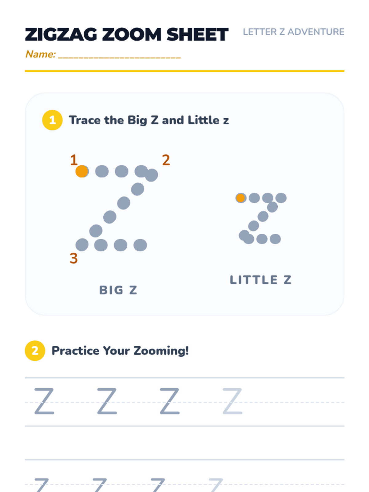 A student worksheet for the letter Z featuring large tracing models, handwriting practice lines, a letter identification grid, and images to color.