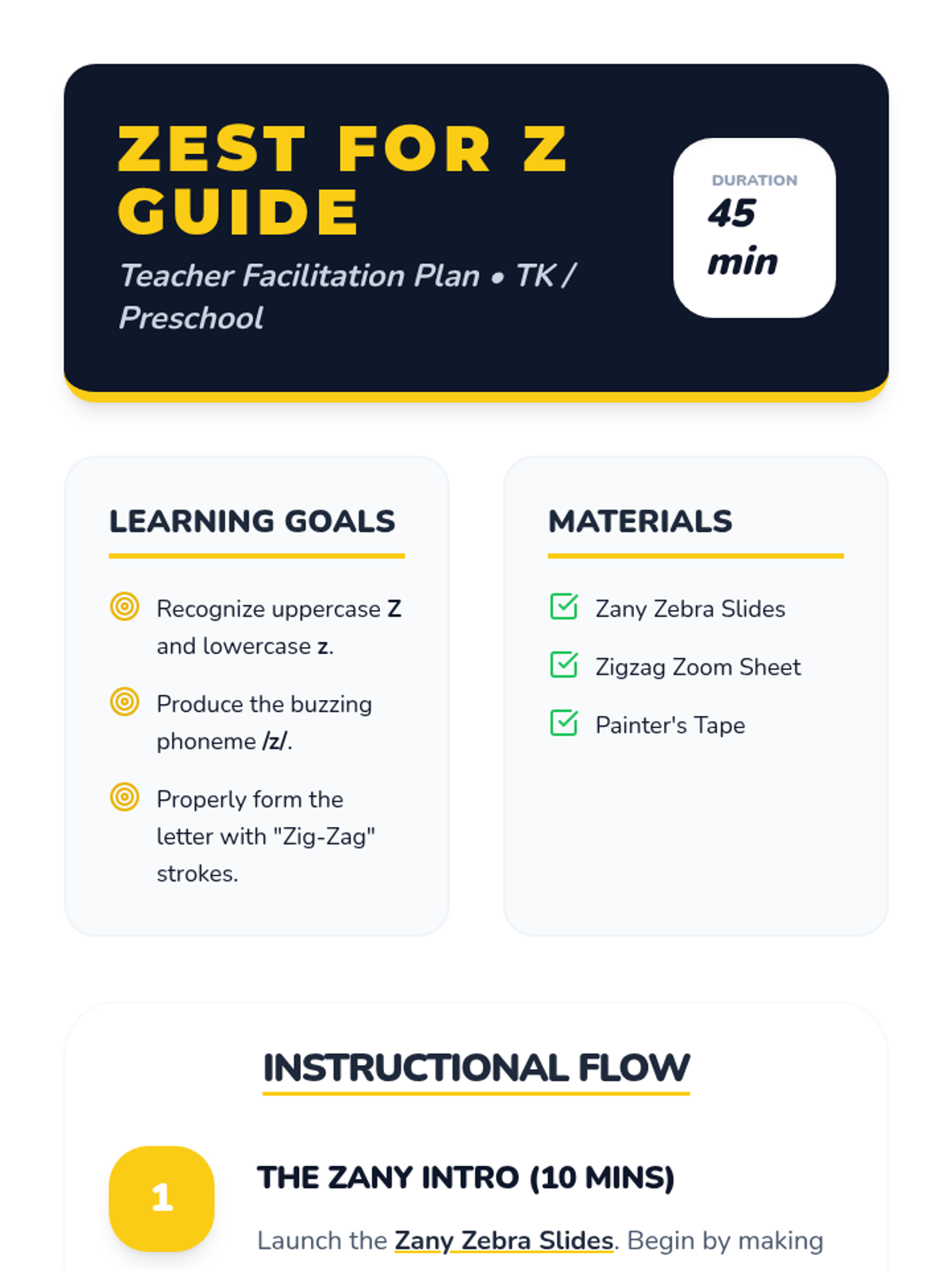 A comprehensive teacher facilitation guide for the letter Z lesson, including learning objectives, a detailed instructional flow, movement activities, and differentiation strategies.