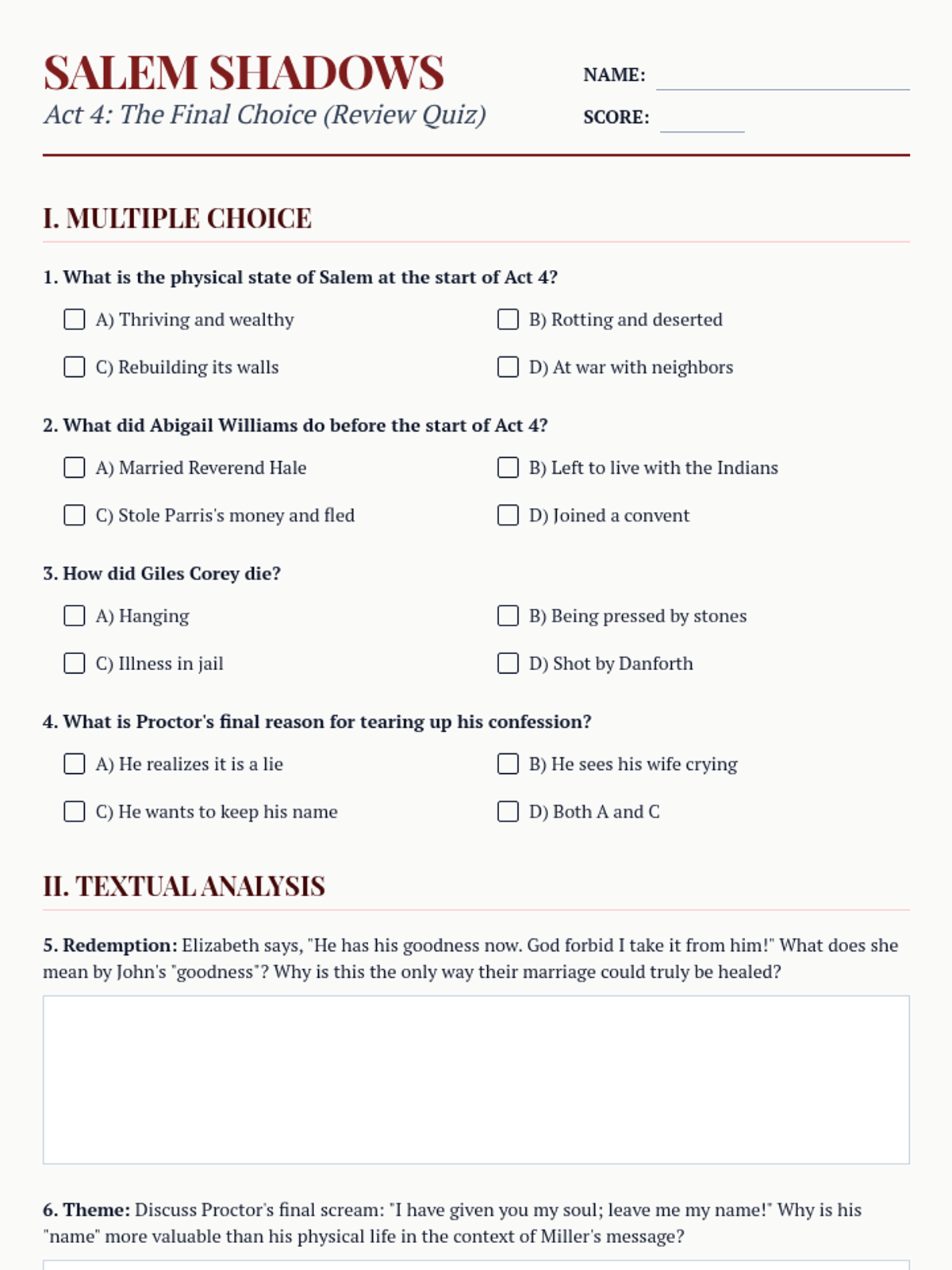 A review quiz for Act 4 of 'The Crucible', focusing on Giles Corey's death, Abigail's flight, and Proctor's decision to tear up his confession.