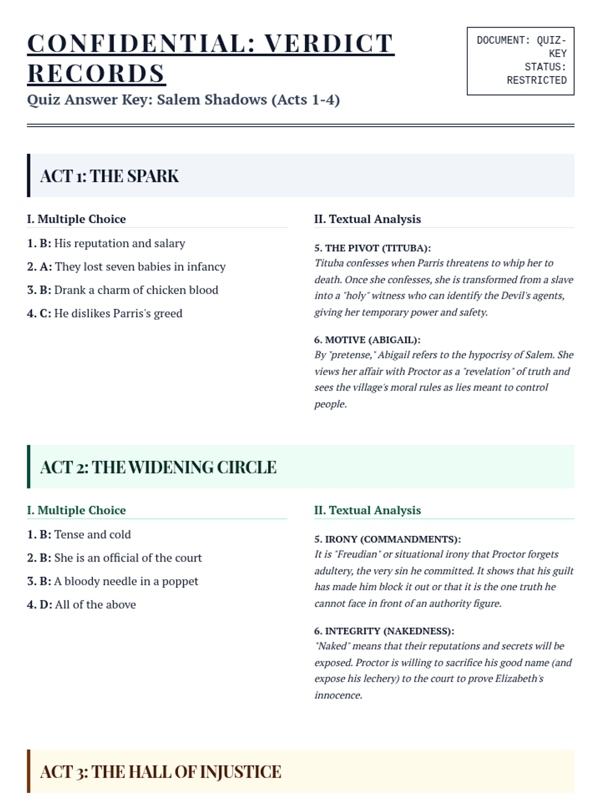 A comprehensive answer key for all four 'The Crucible' act quizzes, including correct multiple-choice options and detailed sample responses for textual analysis questions.