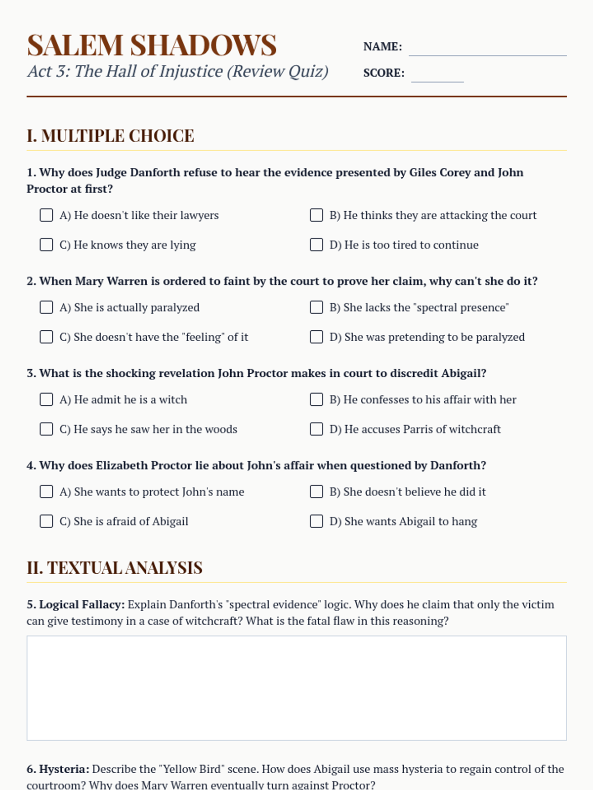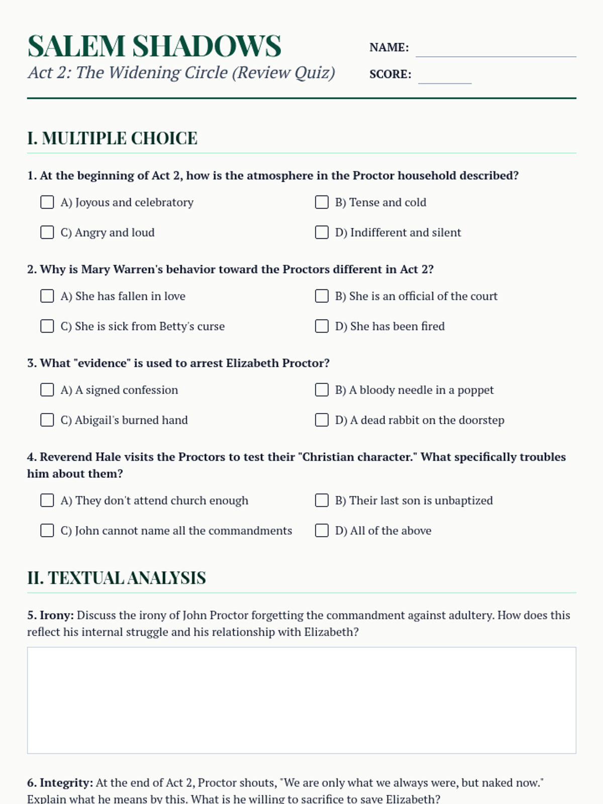 A review quiz for Act 2 of 'The Crucible', covering the Proctor's household tension, Mary Warren's change in status, and the evidence against Elizabeth.