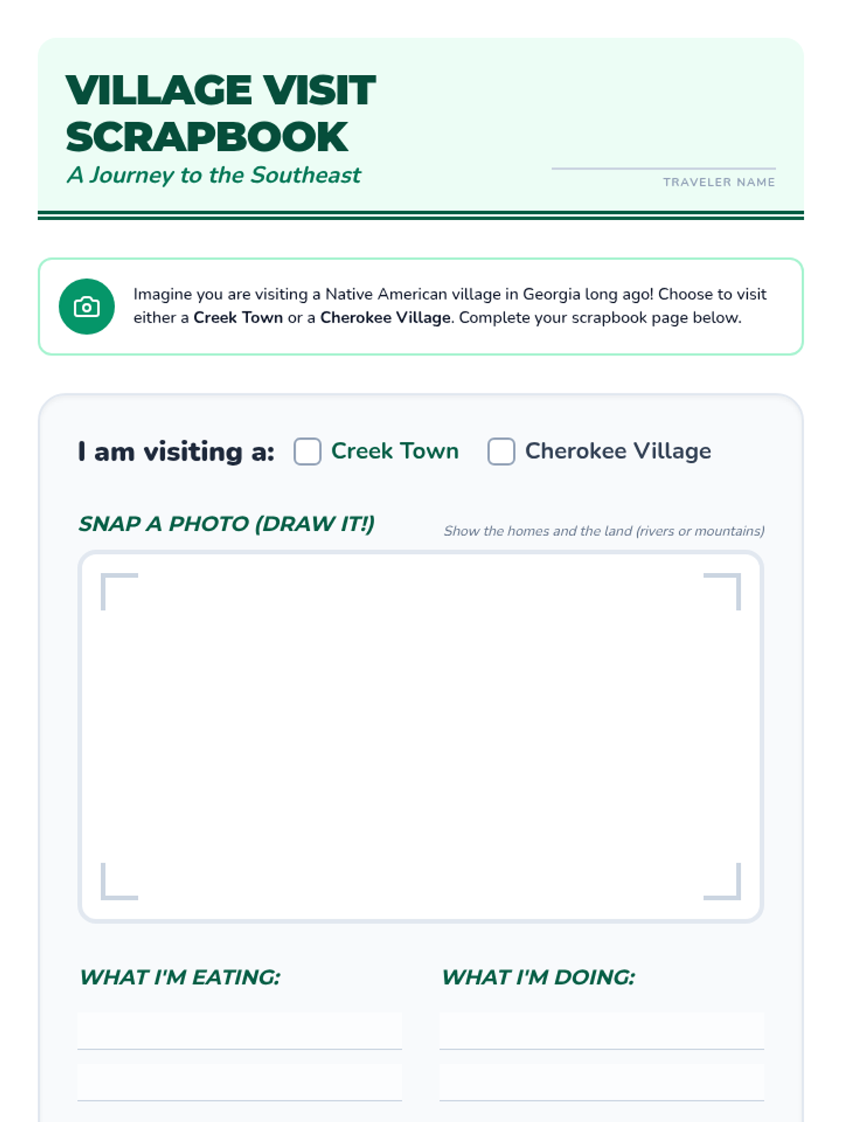 A creative writing and drawing activity where students imagine visiting a Creek town or Cherokee village, detailing their surroundings, food, and activities.