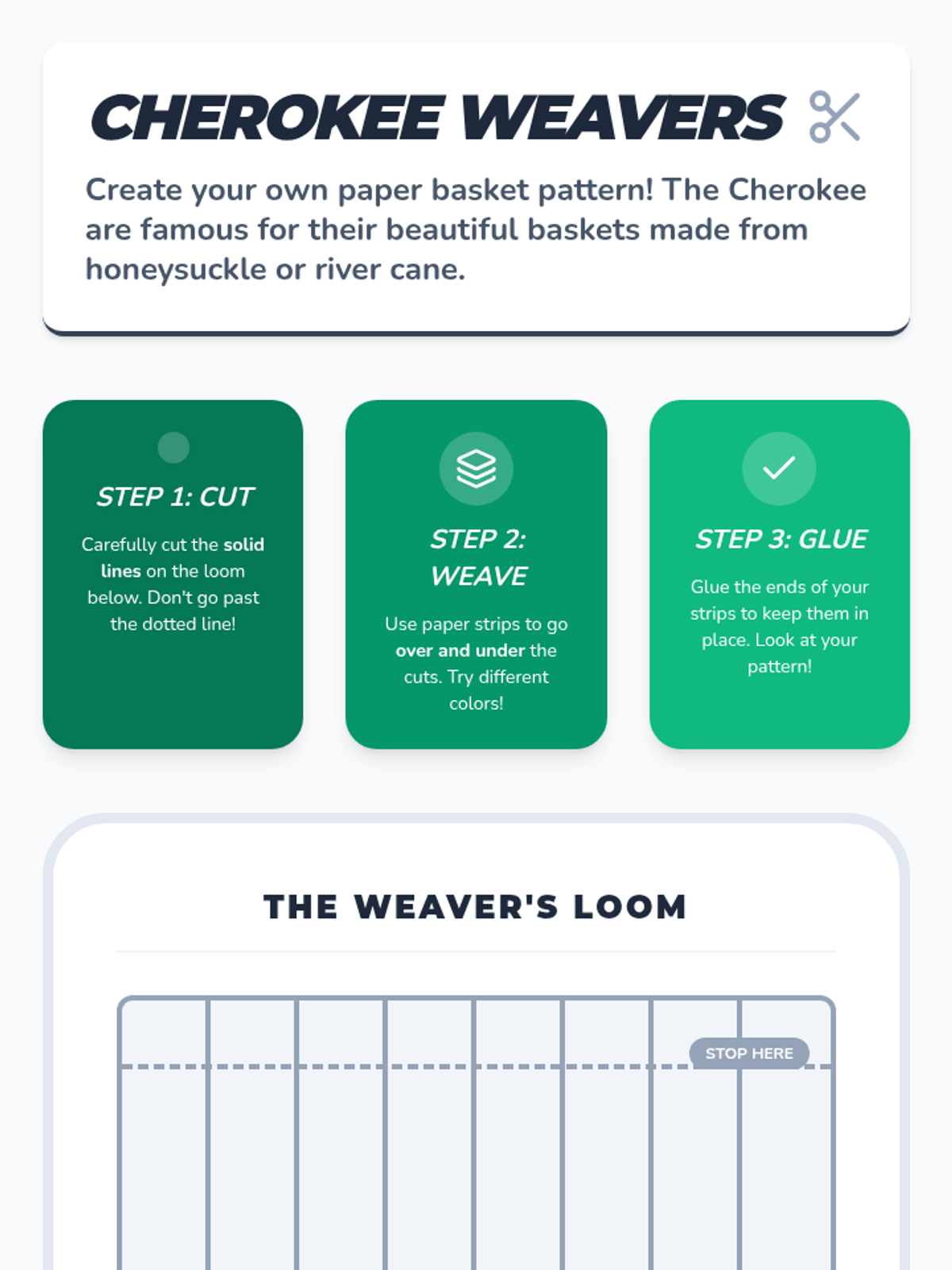 A printable paper weaving loom and instructions for students to create their own patterns, simulating traditional Cherokee basketry.