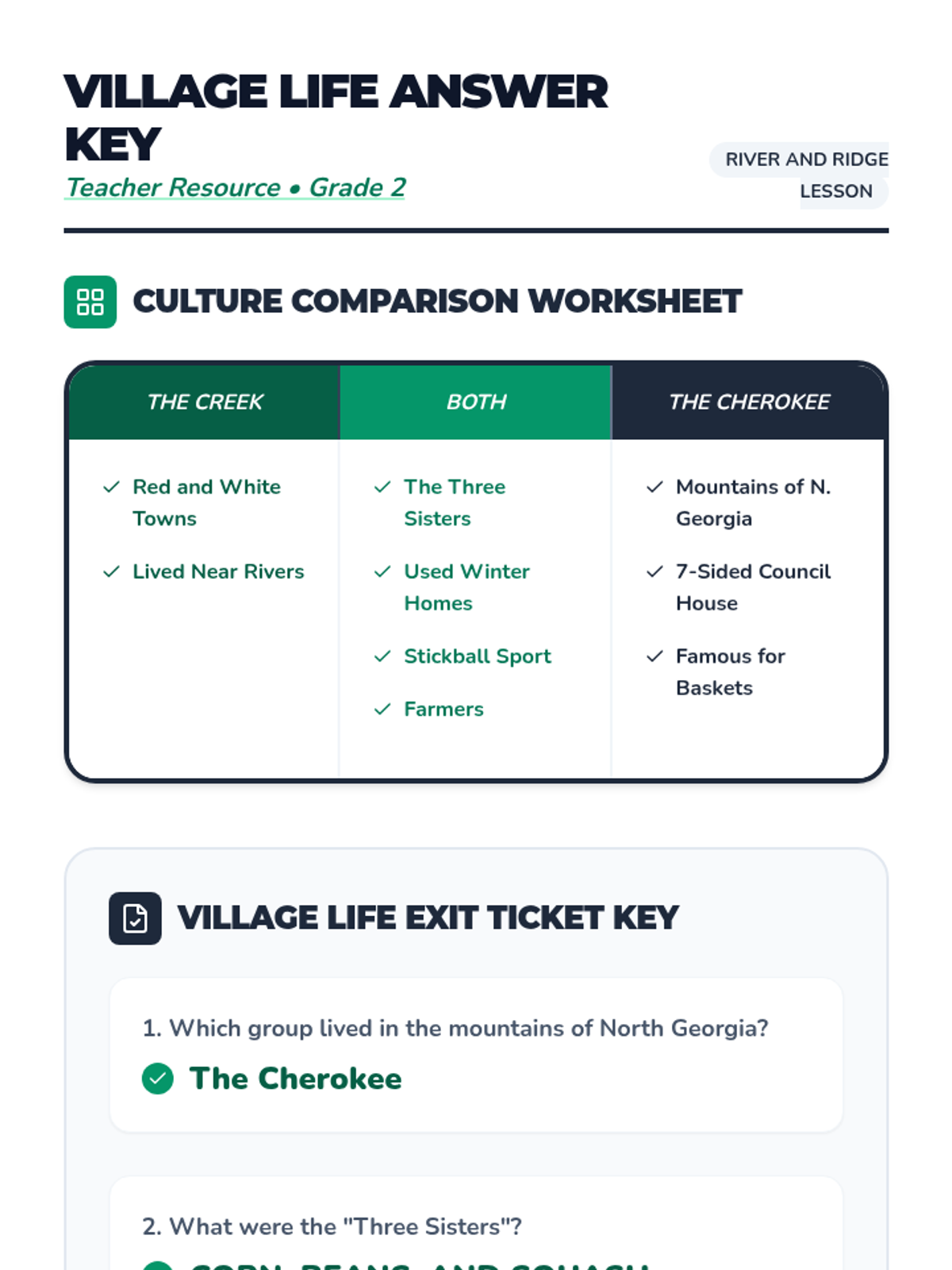 A comparison chart and sorting activity for 2nd-grade students to identify similarities and differences between Creek and Cherokee cultures.