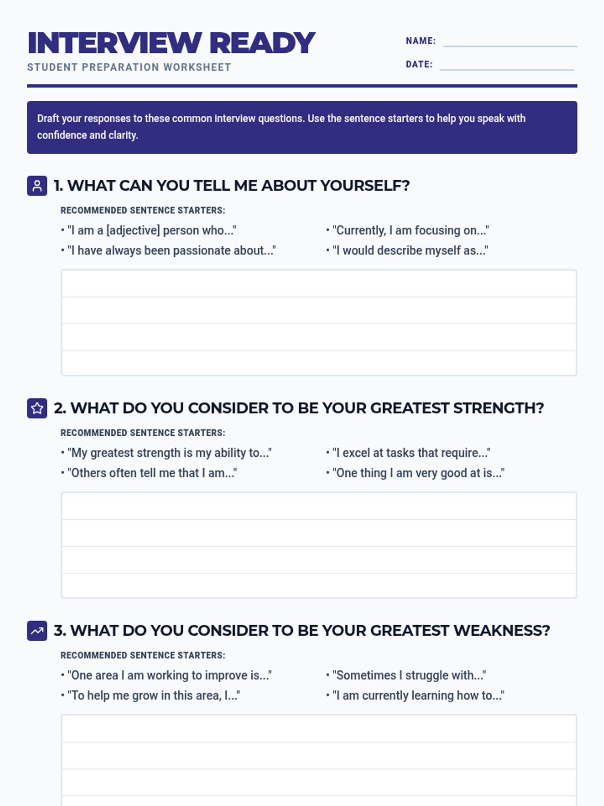 A professional two-page worksheet designed to help students prepare for job interviews. It provides specific sentence starters for five common interview questions and includes ample white space with subtle lined ruling for writing responses.