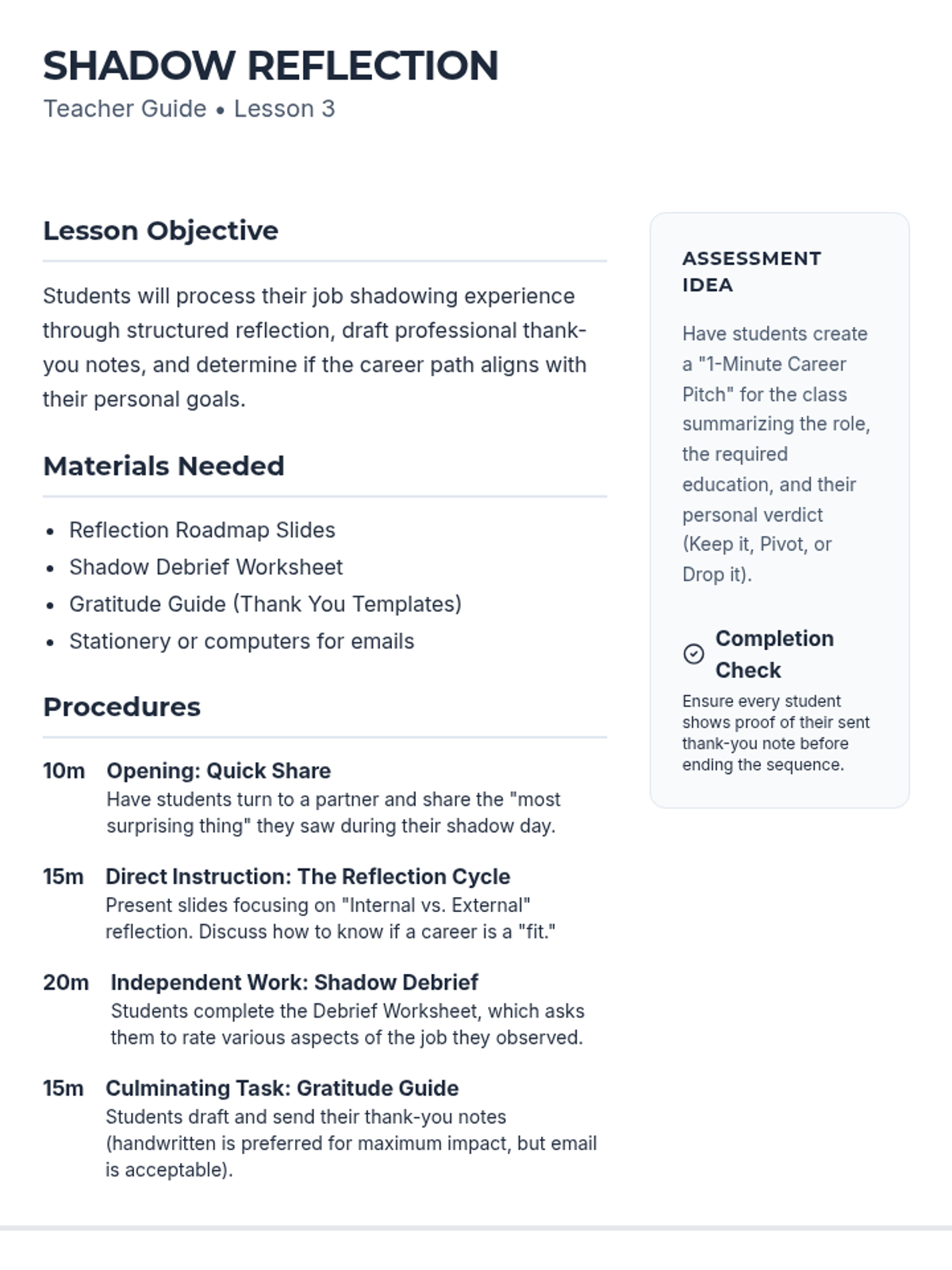 Teacher guide for the final lesson, focusing on post-shadowing reflection, analysis, and gratitude.