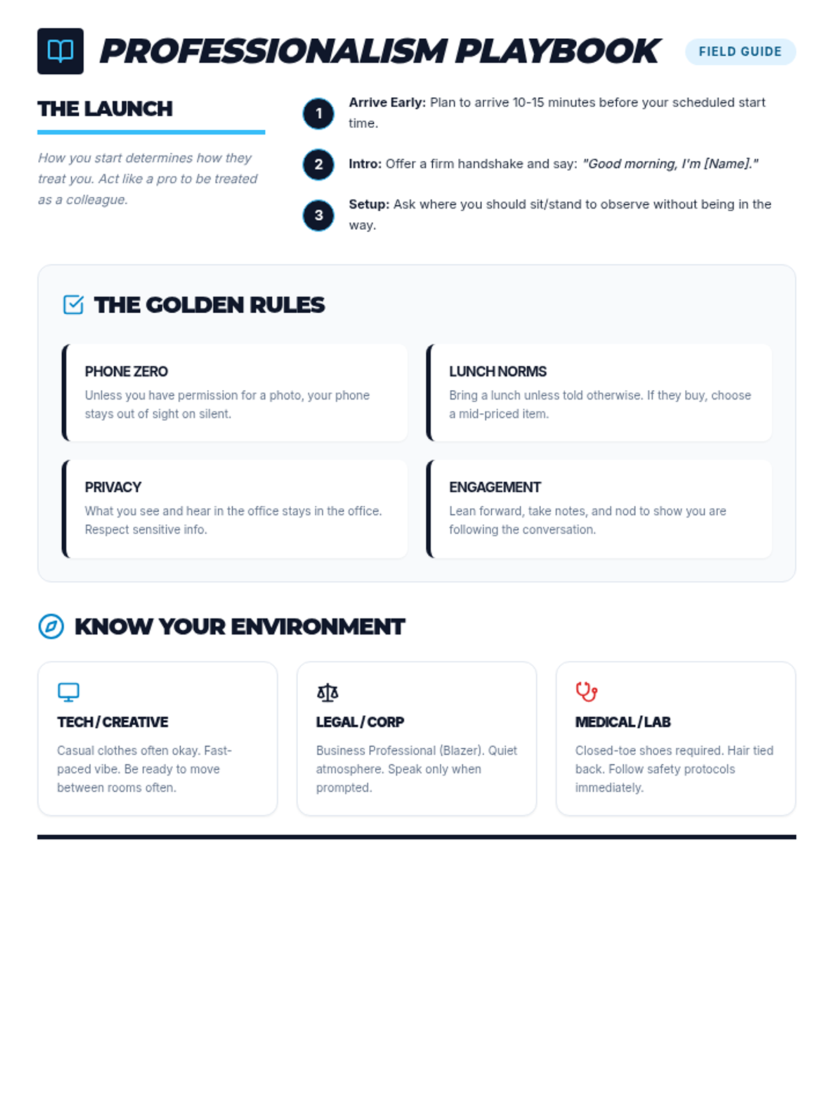 Workplace etiquette guide. Revised to consolidate content onto a single page, increase font sizes for readability, and fix icon rendering issues.