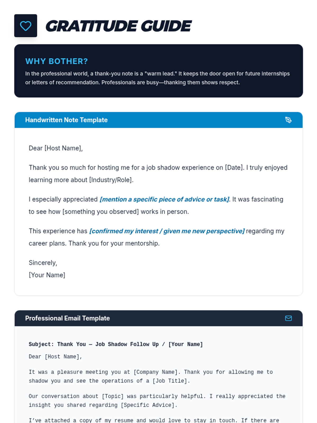 Job shadowing etiquette slides. Revised to fix contrast issues on Slide 4 (white text on dark containers) and improve spacing.