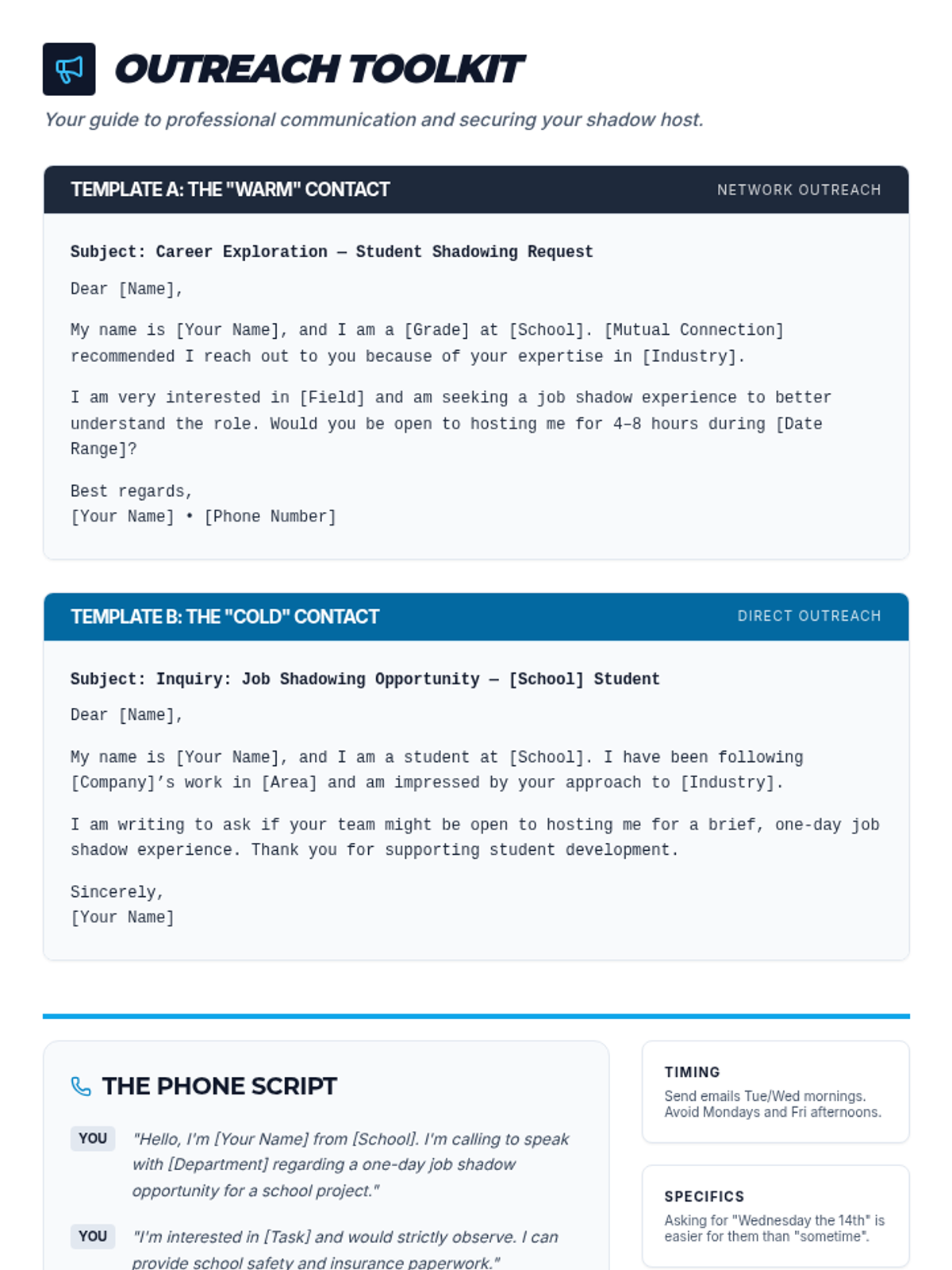 Outreach toolkit for students. Revised to consolidate content onto a single page, improve header alignment, and fix page break issues.