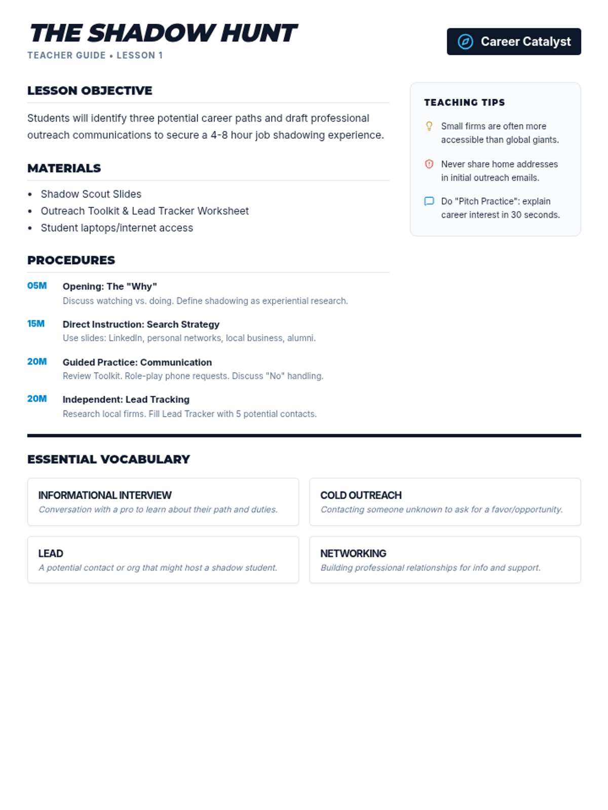 Teacher guide for Lesson 1. Revised to consolidate content onto a single page, improve sidebar alignment, and fix page break issues.