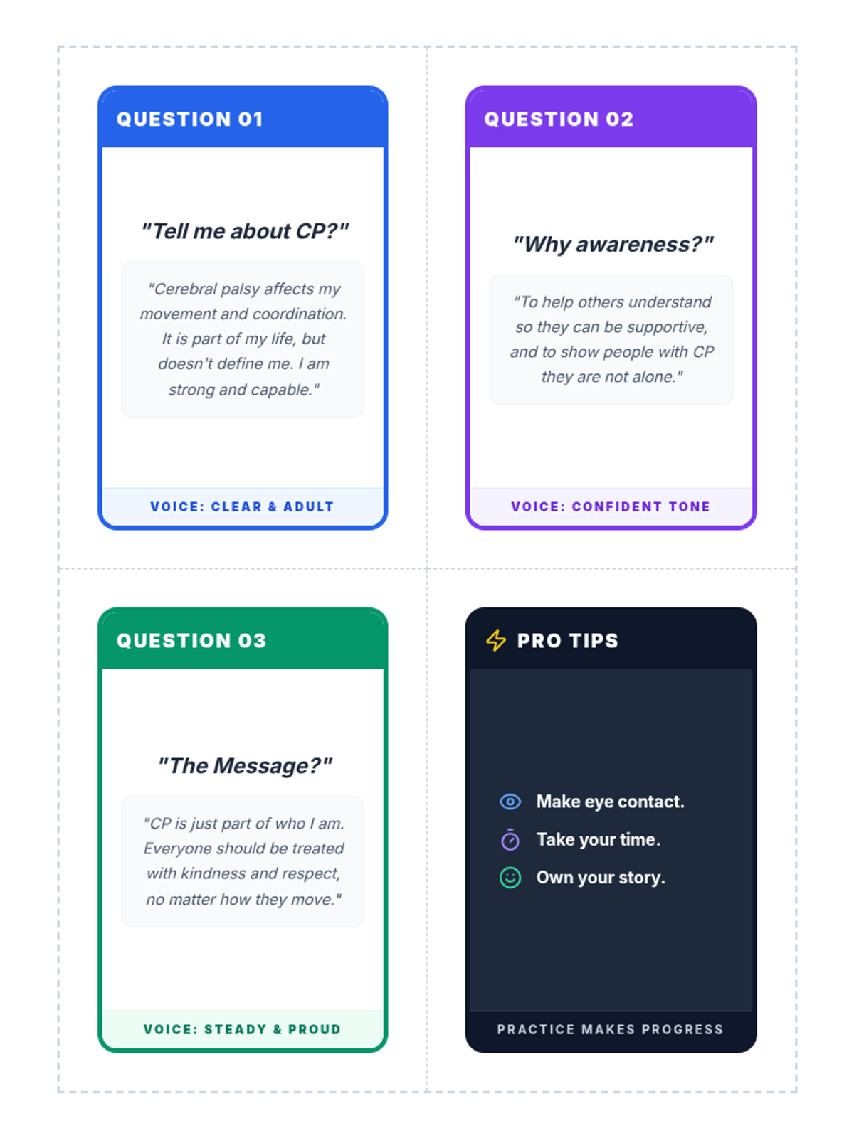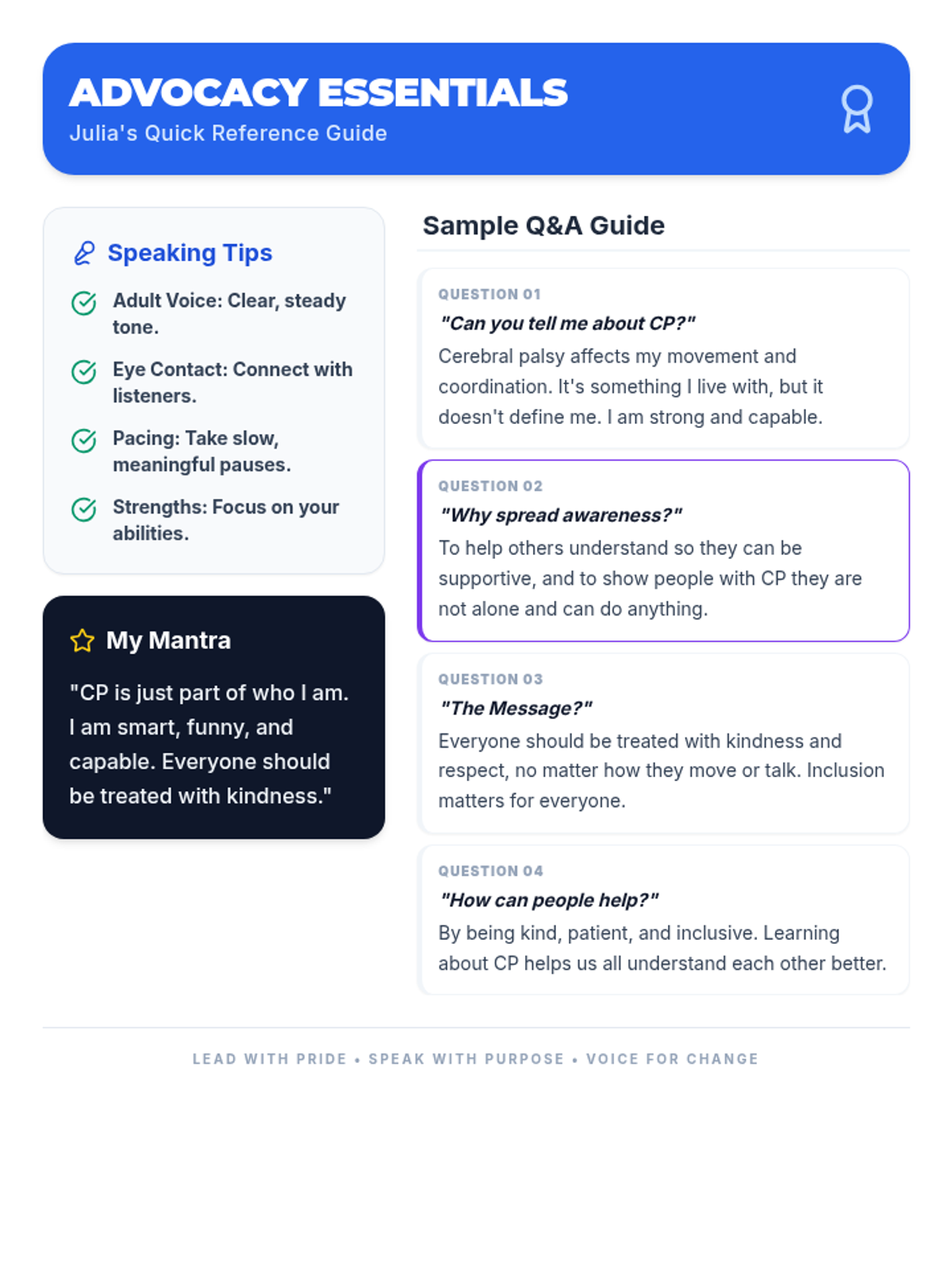 Handy, printable cue cards to help Julia practice responding to common advocacy questions. Includes conversational prompts and professional speaking reminders.