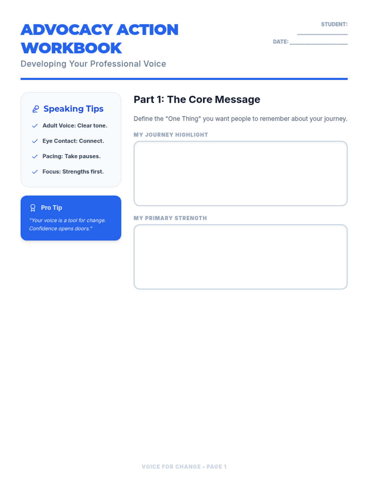 A professional-style student workbook for an adult learner. Includes reflection spaces, guided response drafting for common questions, and integrated advocacy tips.