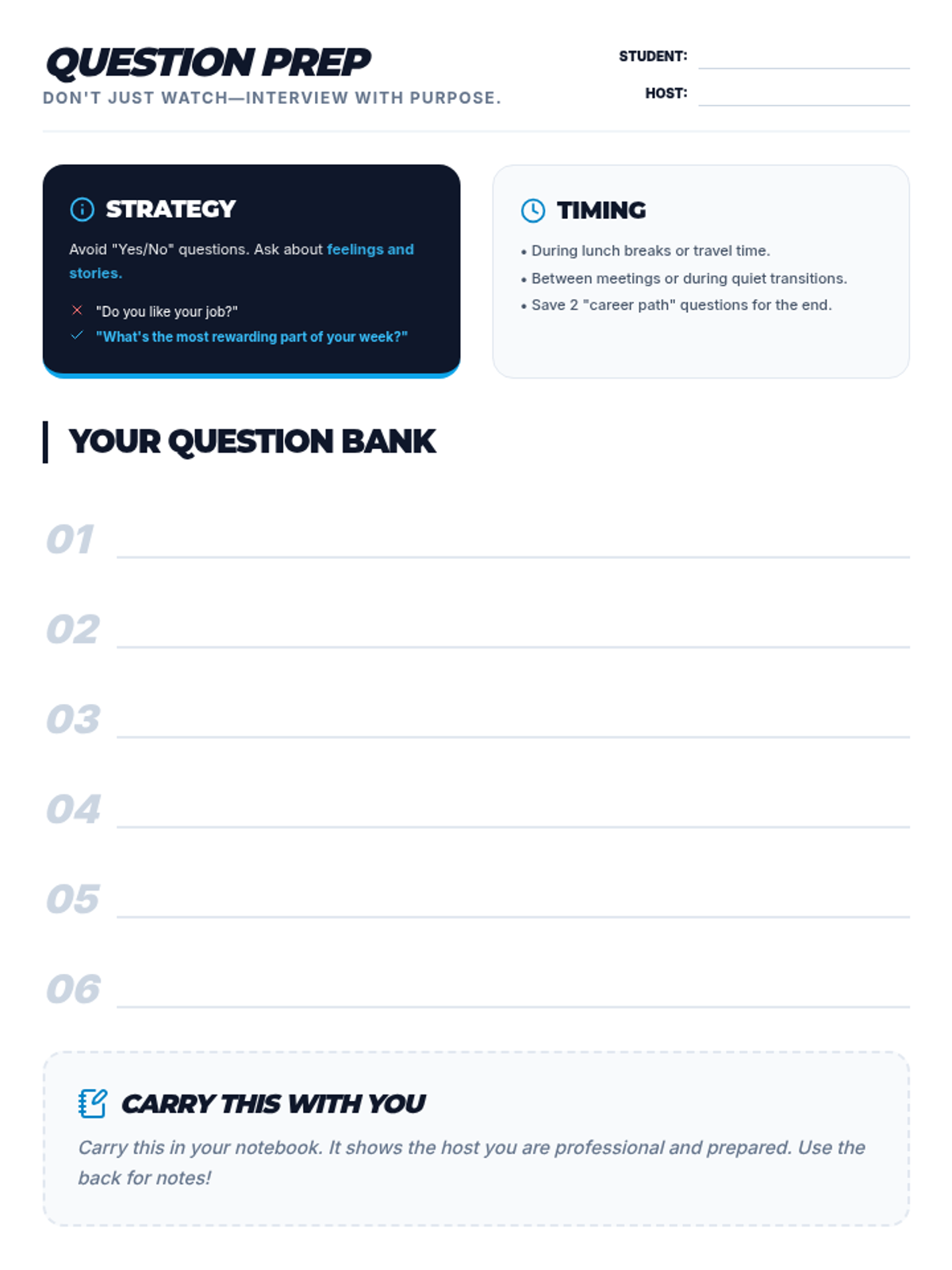 A preparation worksheet for students to draft and organize questions for their job shadow host. Revised to increase writing line height, fix header alignment, and ensure all content fits on one page.