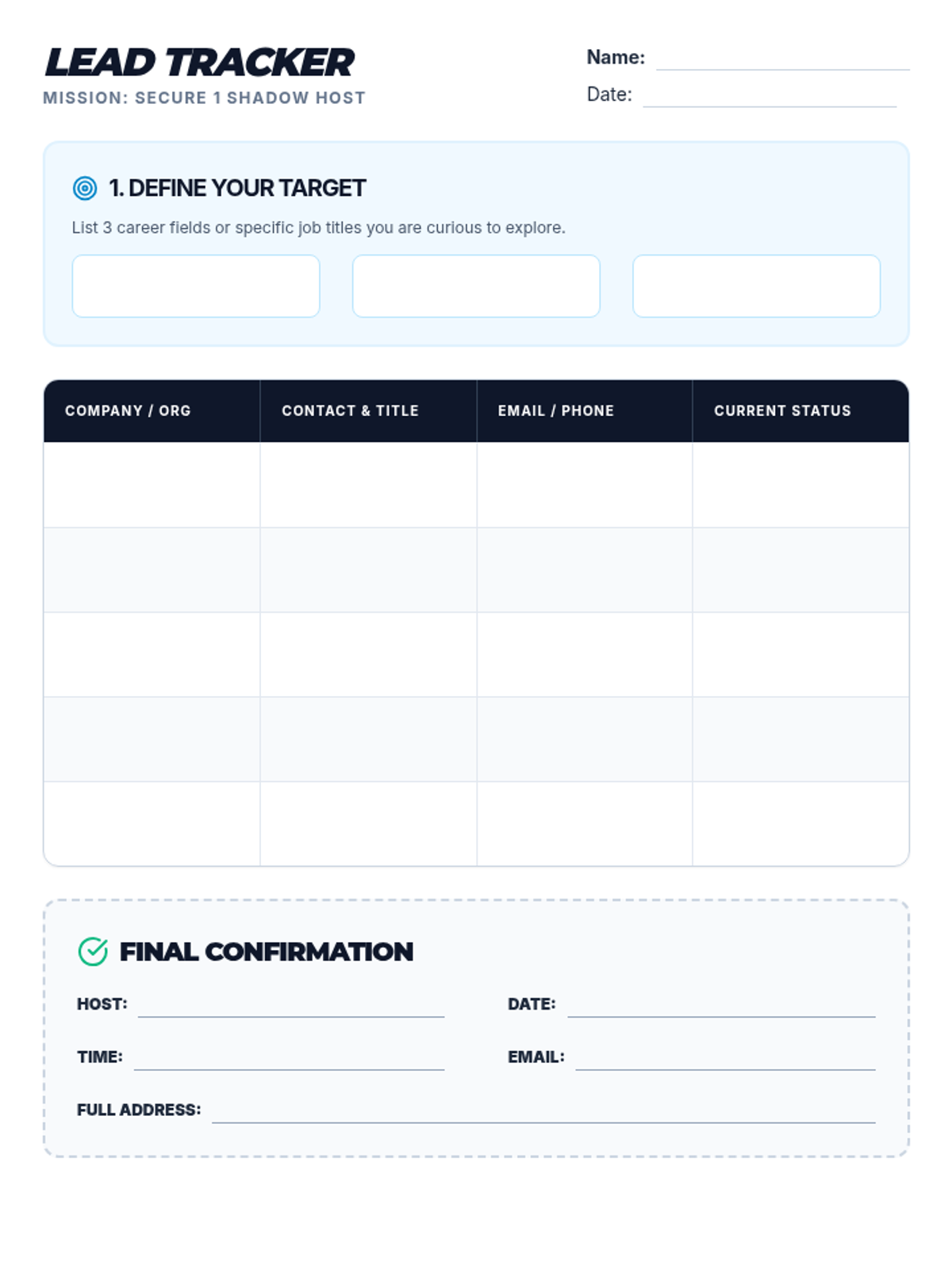 Lead tracker for students. Revised to fit all content on a single page, fix label alignment in the confirmation section, and ensure table header visibility.