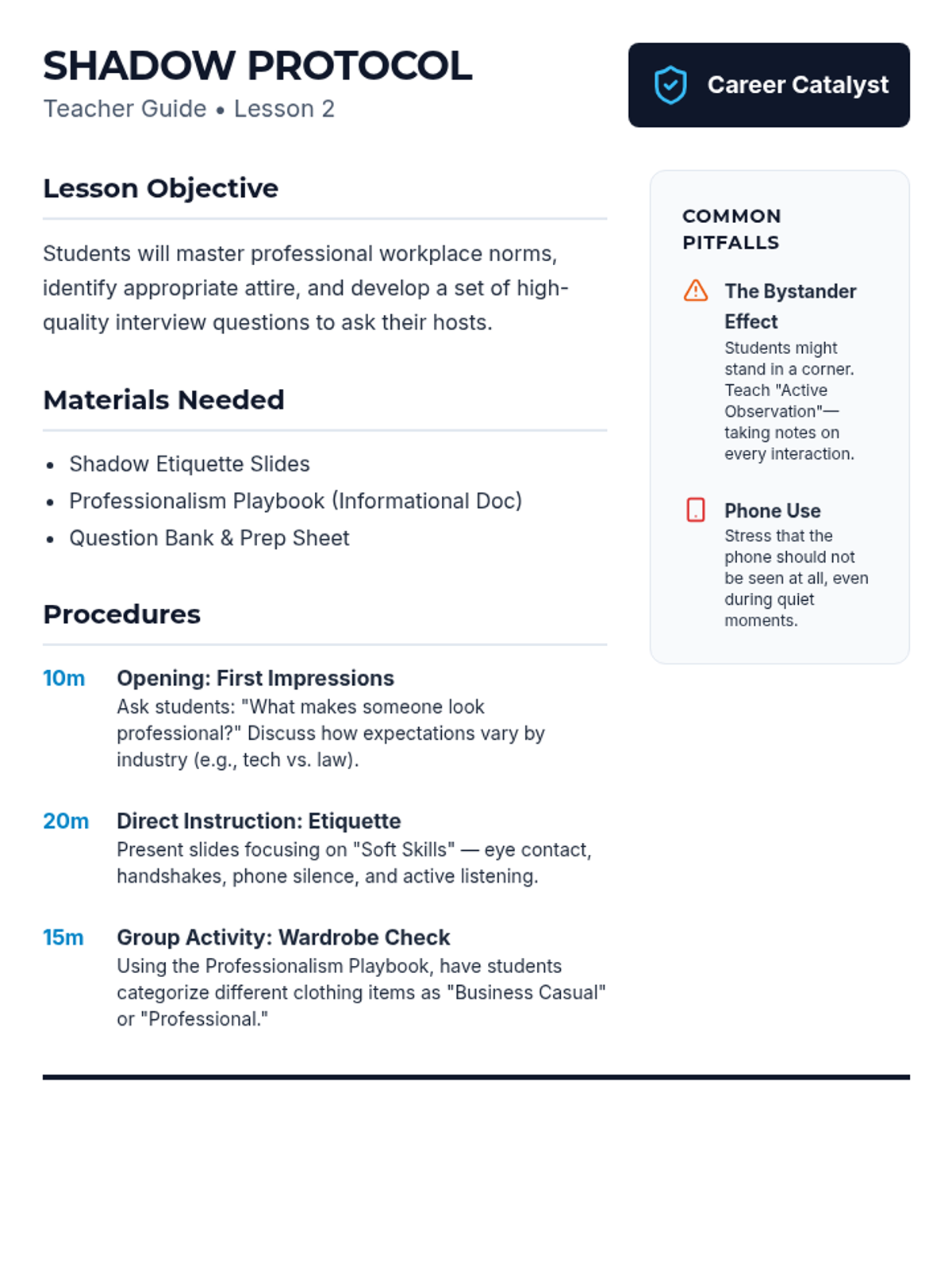 Teacher guide for Lesson 2. Revised to fix missing branding, improve sidebar layout for better text wrapping, and clarify pitsfalls.