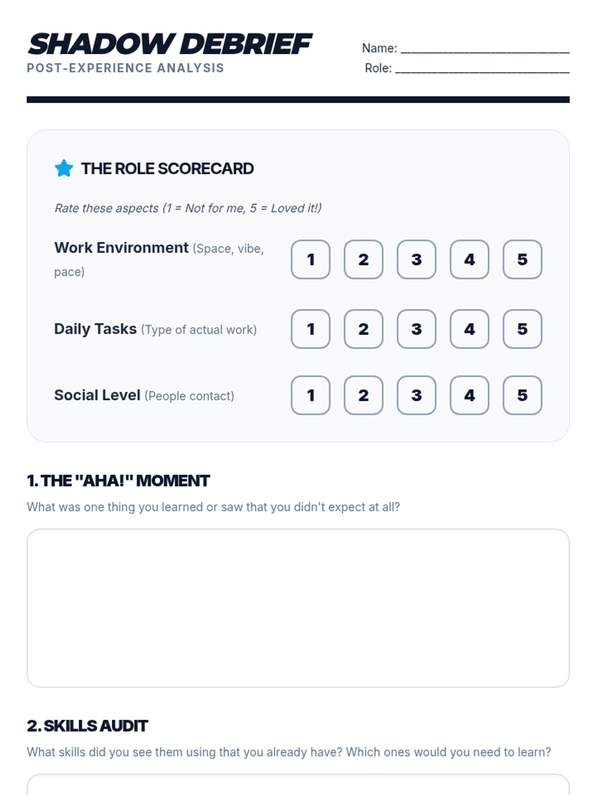 Shadow debrief worksheet. Revised to significantly increase writing space, improve legibility of scorecard numbers, and fix page break issues.
