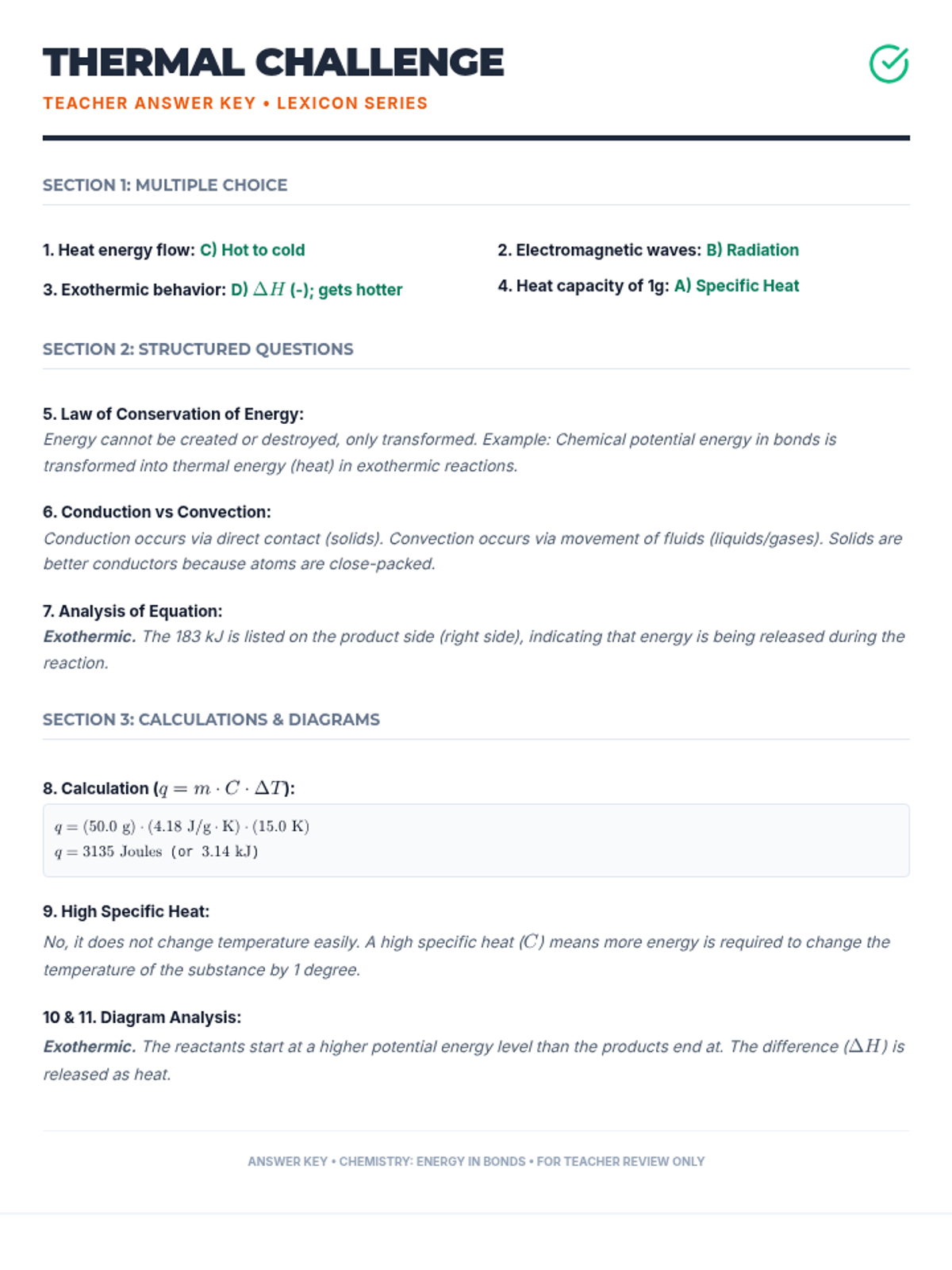A detailed answer key for the Thermal Challenge Worksheet, providing solutions for the multiple-choice questions, structured answers, and the specific heat calculation problem.