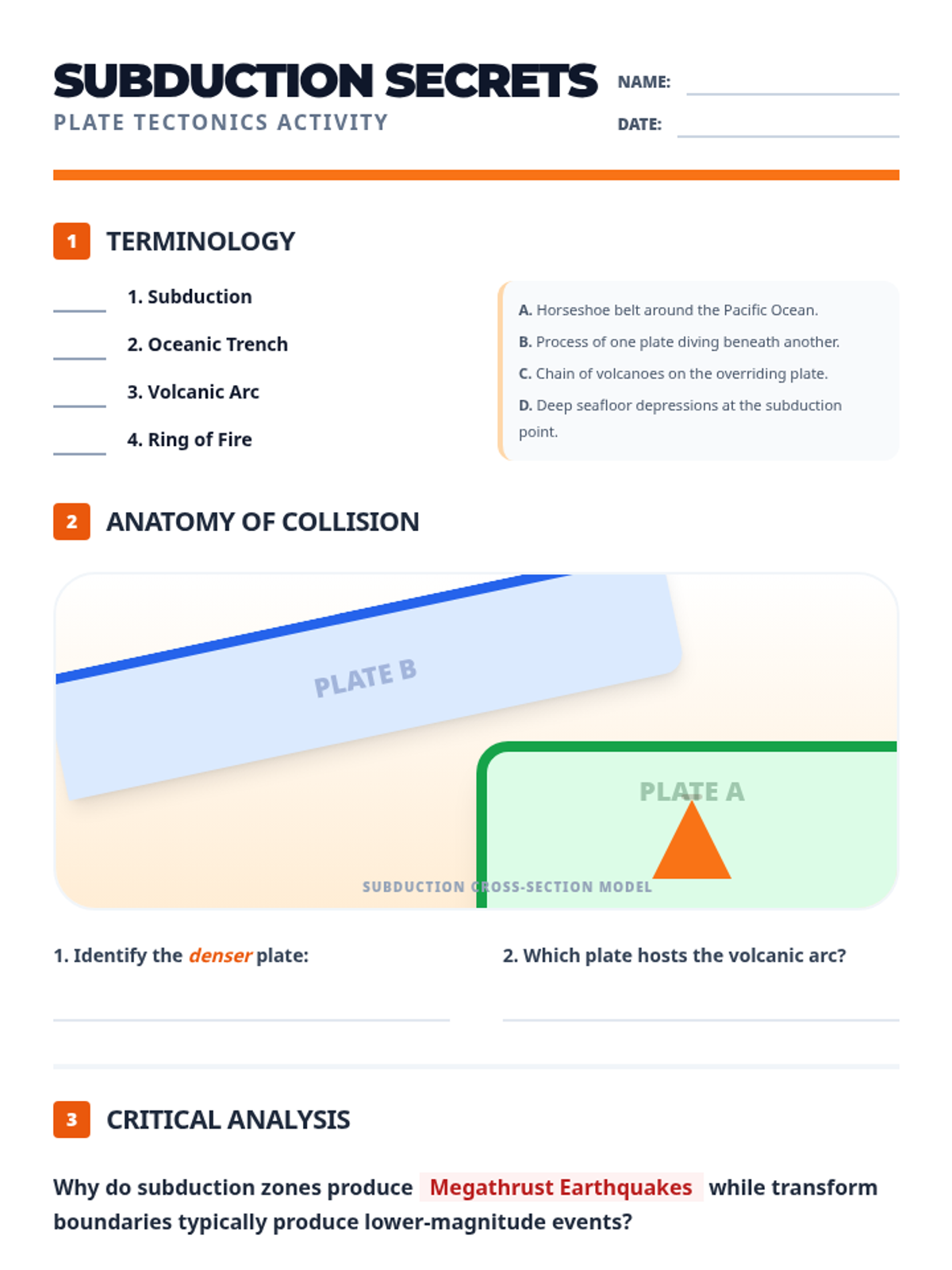A focused worksheet for students to reinforce concepts from the Fire Ring Slides, featuring vocabulary matching, diagram analysis, and critical thinking questions about the mechanics of subduction and the Ring of Fire.