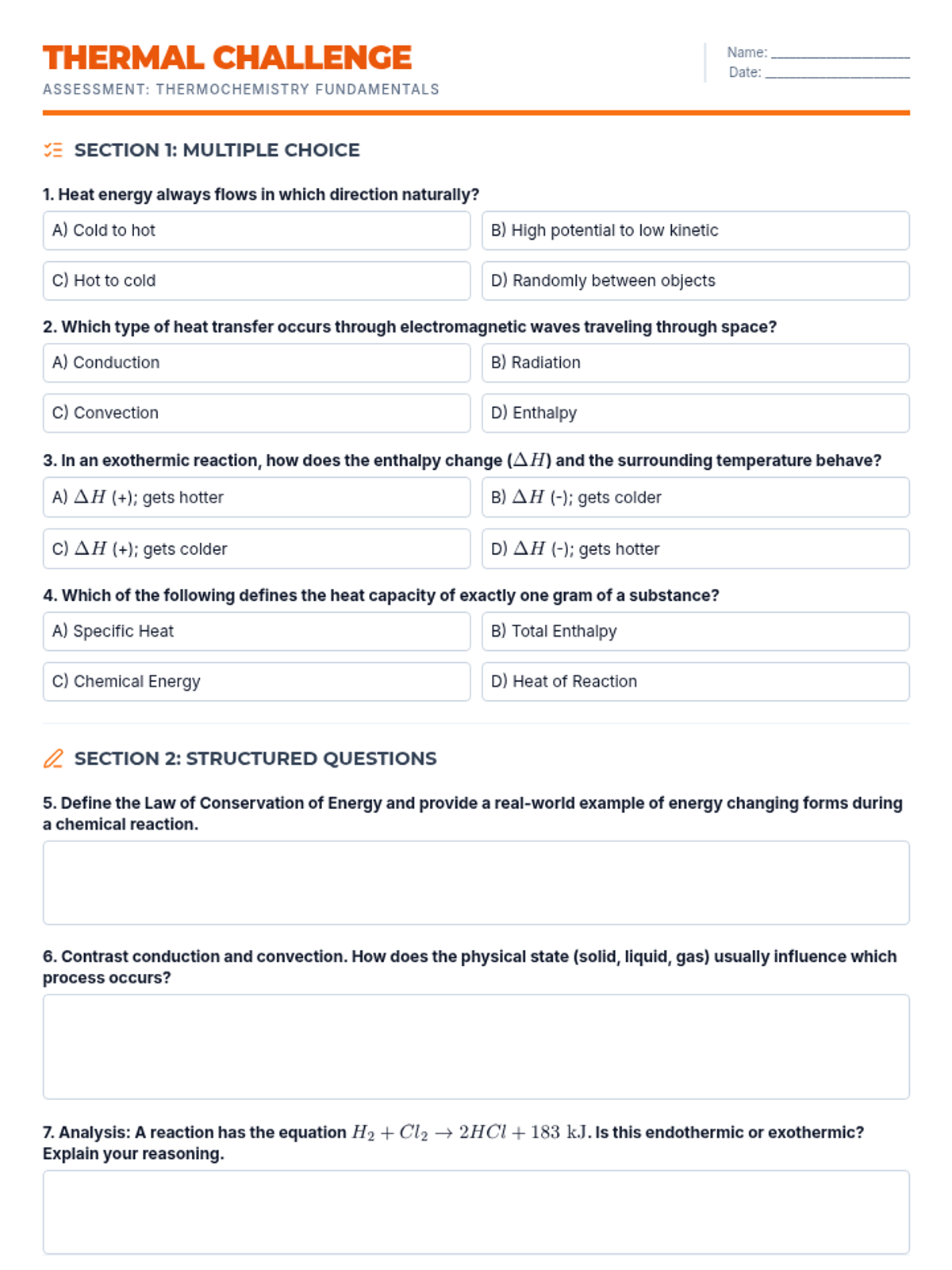 A two-page assessment worksheet based on the thermochemistry notes. It includes multiple-choice questions on heat transfer and enthalpy, structured questions for theoretical understanding, and a dedicated calculation zone for specific heat problems.