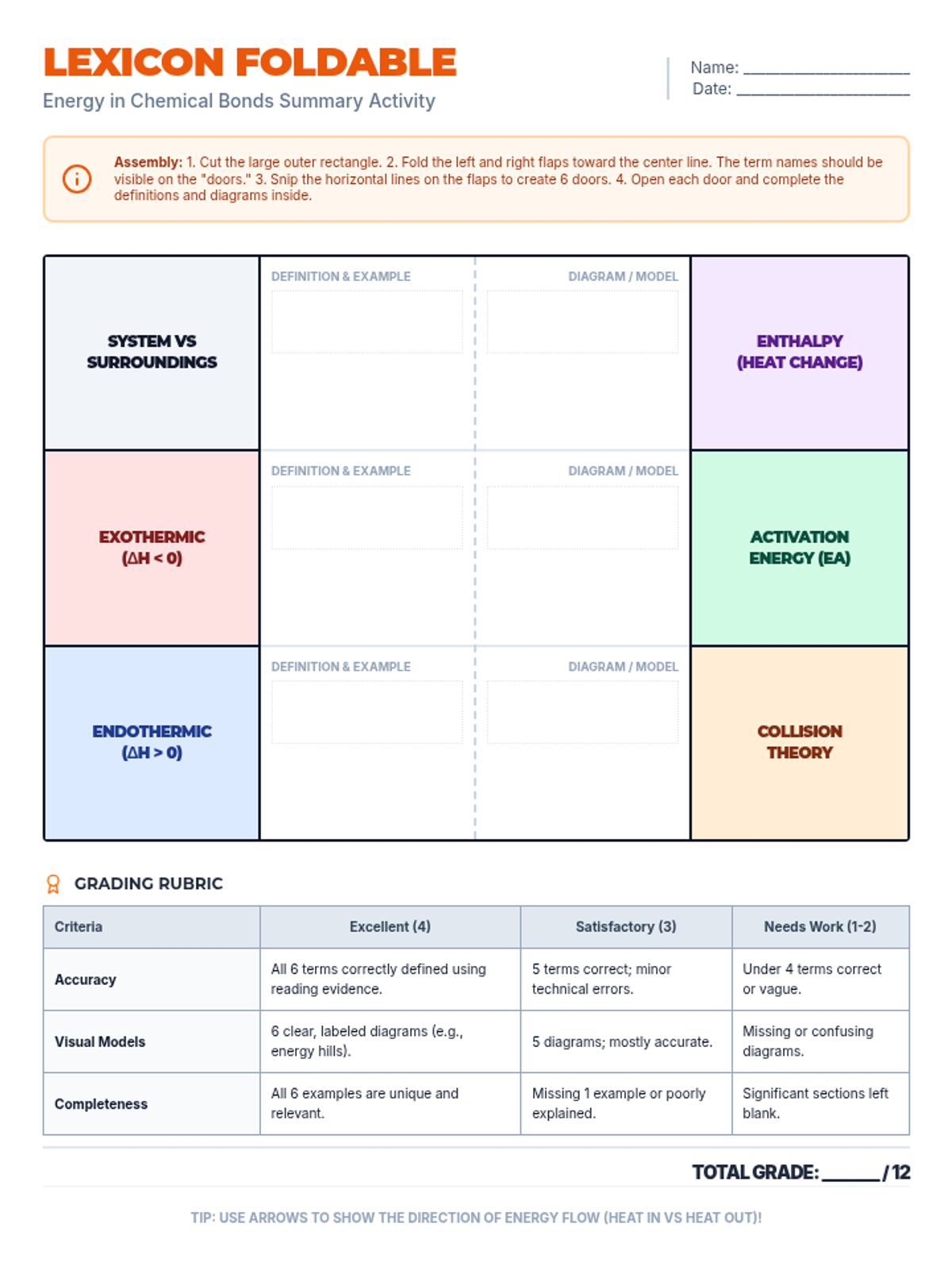 A single-page foldable template designed for a shutter-fold assembly. It includes spaces for six key thermochemistry terms from the lexicon articles, with designated writing areas for definitions, diagrams, and examples. A 12-point rubric is included at the bottom for easy grading.