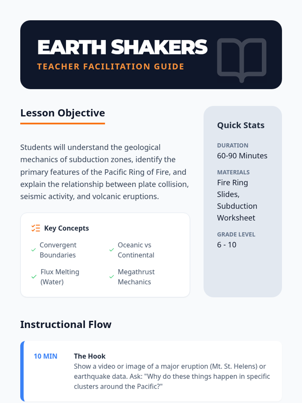 A comprehensive visual presentation covering the mechanics of subduction zones and the explosive geological activity within the Pacific Ring of Fire. Ideal for high-impact classroom instruction with large, readable text and clear diagrams.