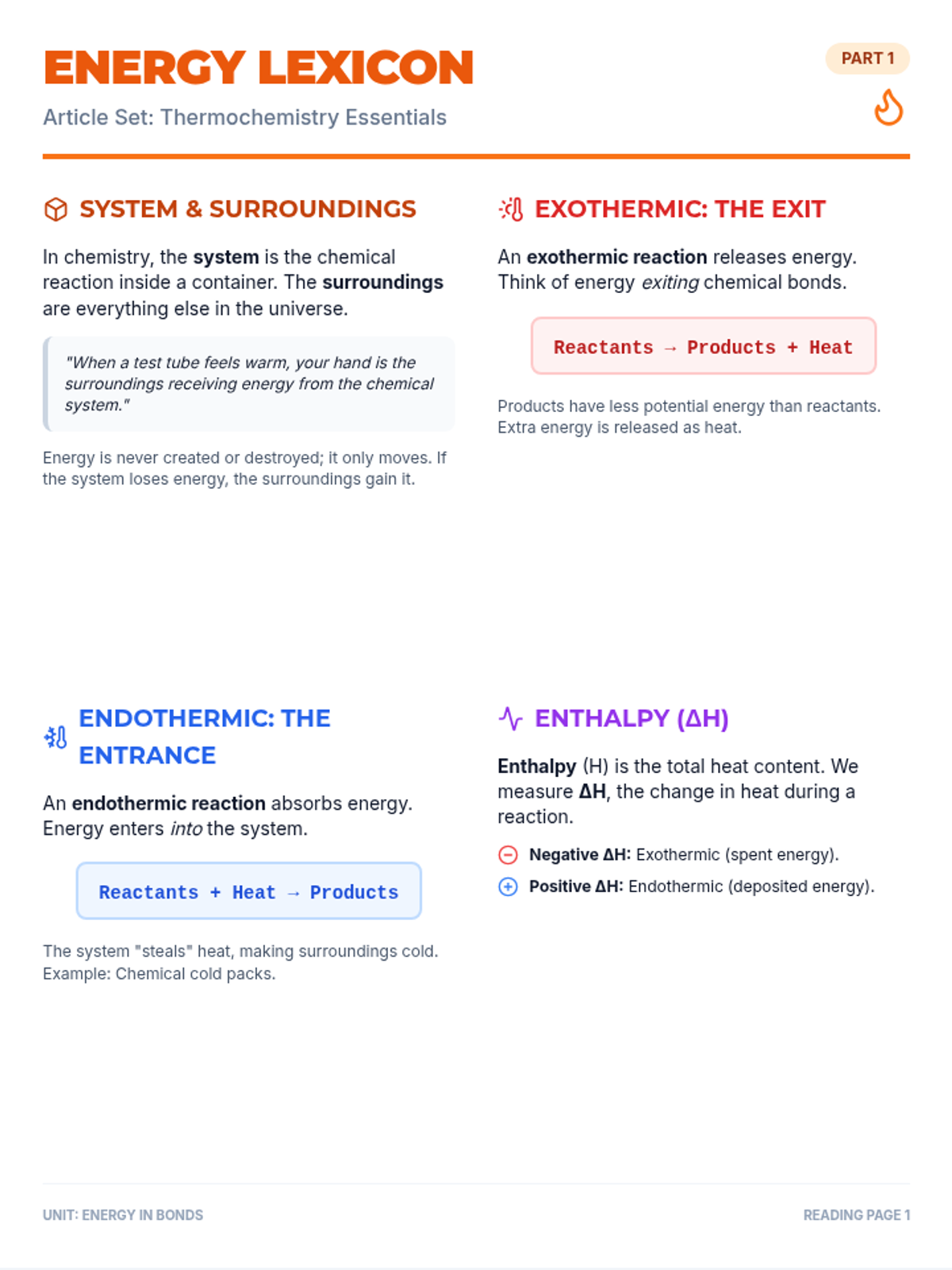 A two-page set of chunked reading articles covering six key thermochemistry terms: System/Surroundings, Exothermic, Endothermic, Enthalpy, Activation Energy, and Collision Theory. Each section includes clear definitions, simplified reaction equations, and real-world connections.