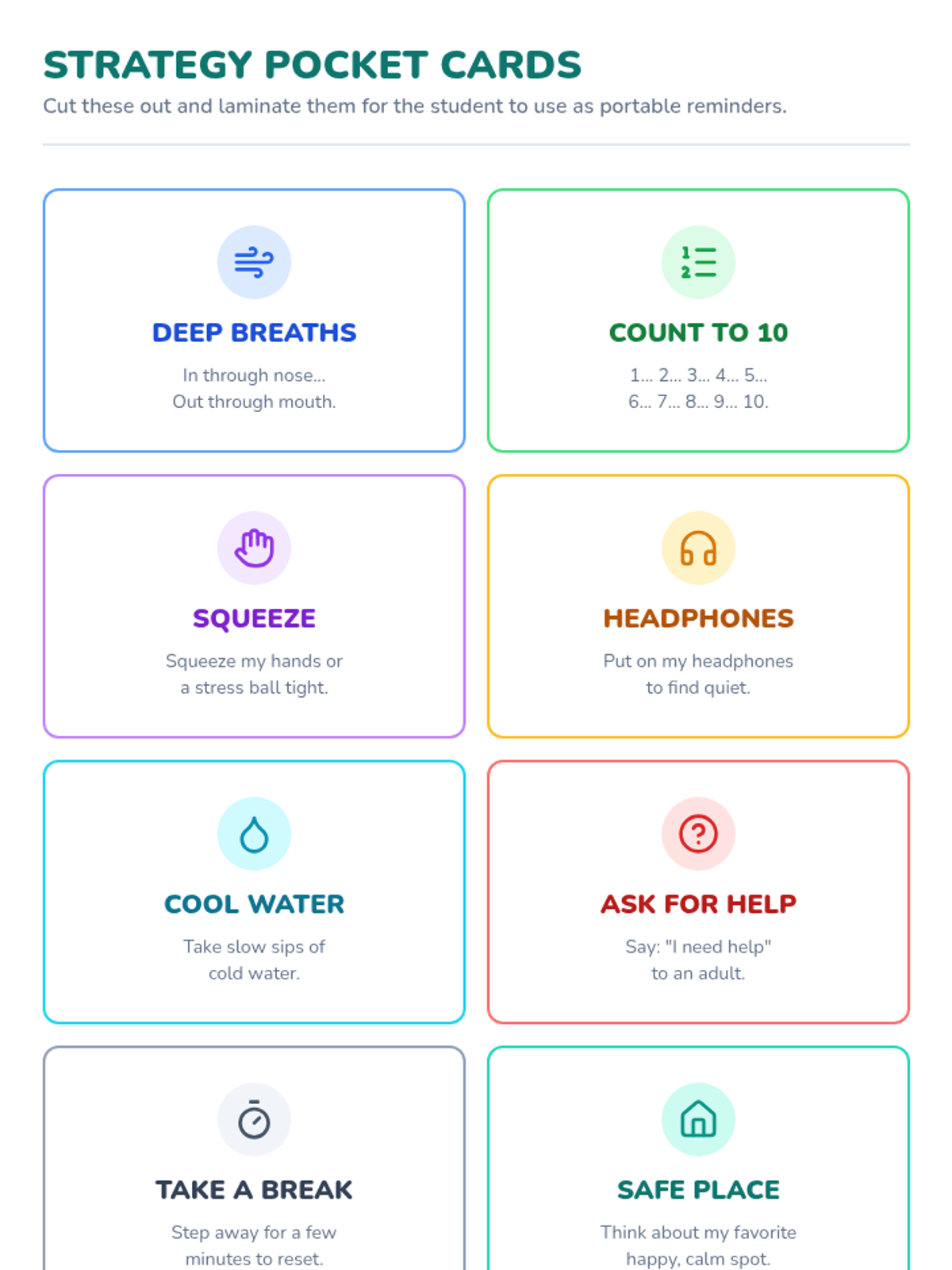 A set of 8 portable strategy cards designed to be cut out and laminated, providing students with autism immediate visual cues for coping strategies.