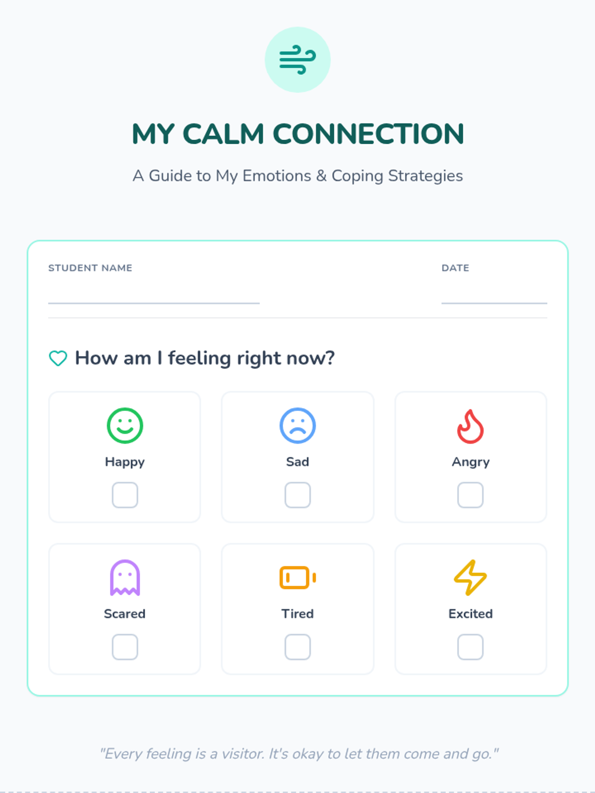 A 5-page therapeutic booklet for students with autism focusing on emotion identification, coping strategies, and personal calm-down planning through visual aids and drawing activities.