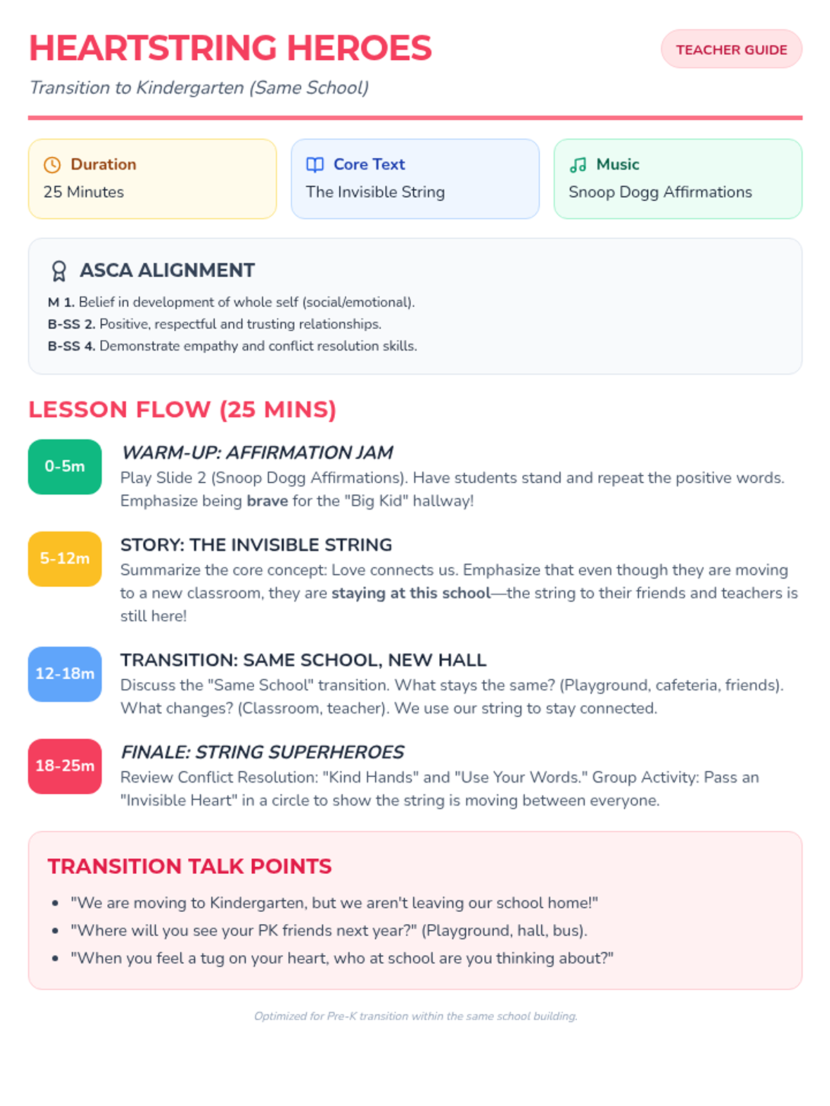 A comprehensive teacher's guide for a 25-minute PK guidance lesson based on 'The Invisible String'. Includes ASCA alignment, a detailed pacing guide, and facilitation questions focused on transitions and friendship. Tightened for a single-page print.
