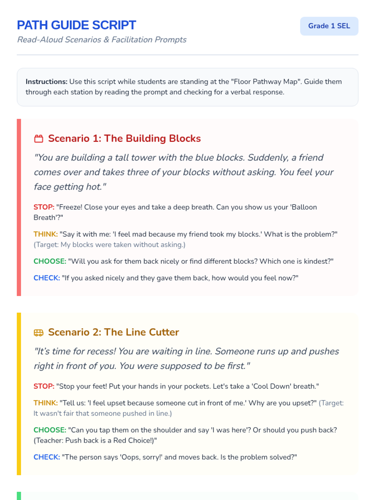 A teacher-led script with conflict scenarios. Updated with 'break-inside-avoid' to prevent scenarios from splitting across pages and included target answers for facilitator guidance.