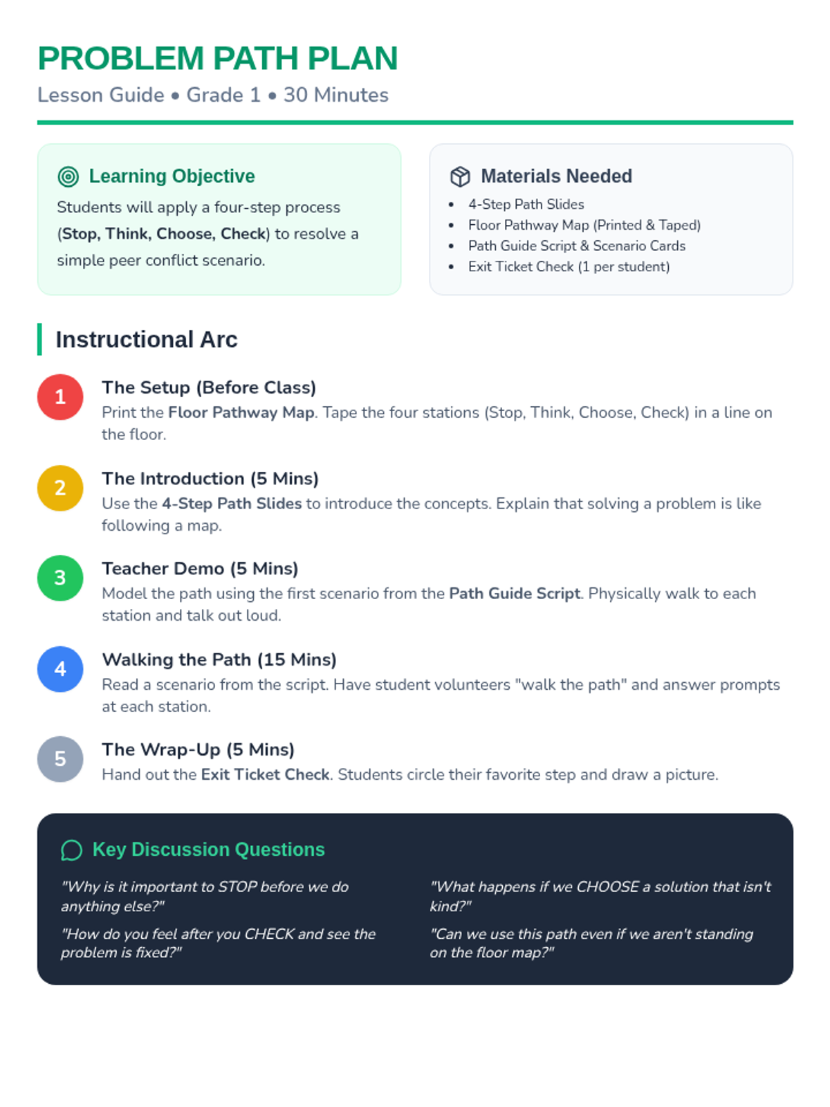 A comprehensive teacher guide for the 'Problem Solving Path' lesson, including timing, materials list, instructional steps, and discussion prompts. Tightened layout to fit on one page.