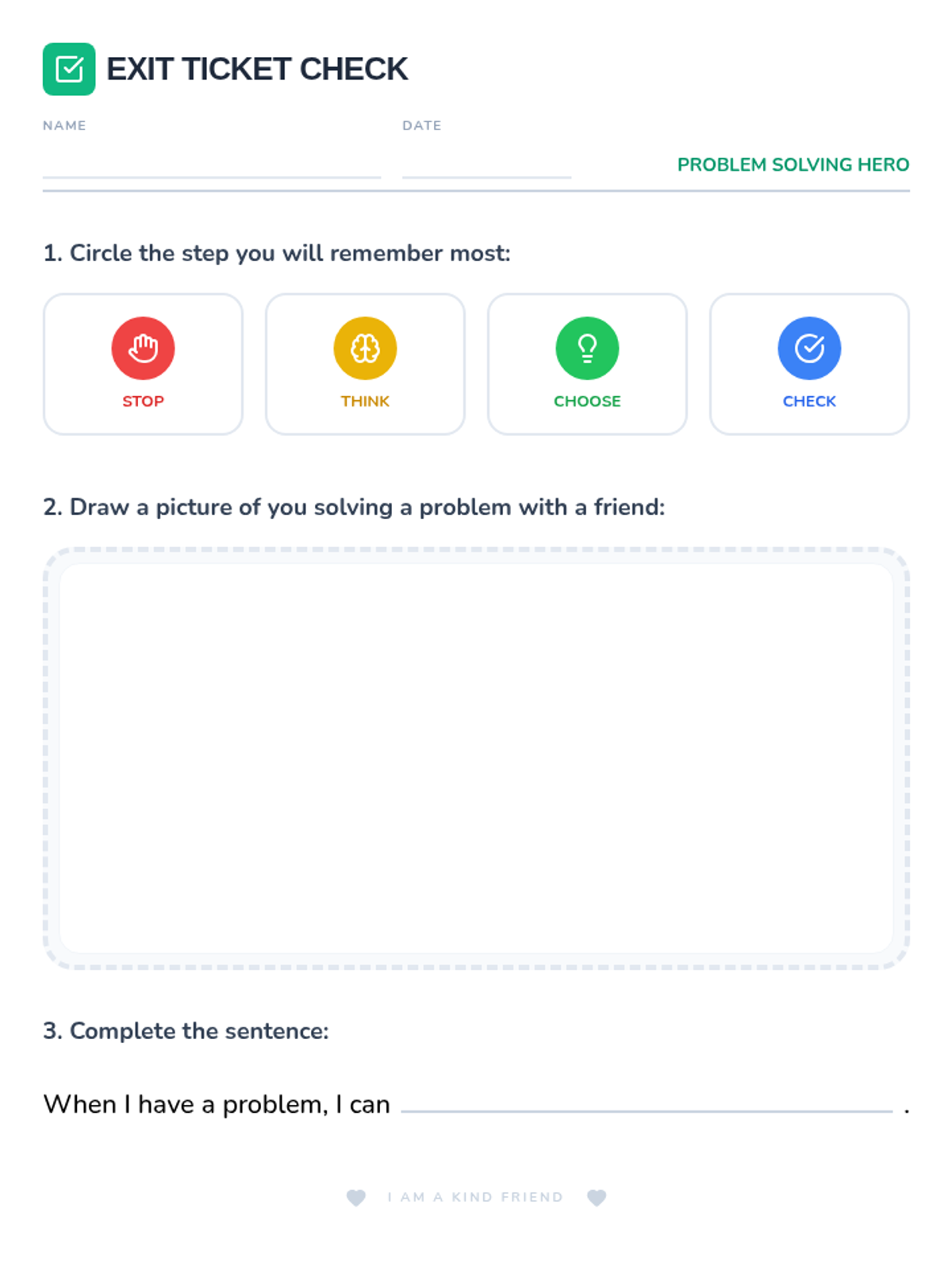 A simple exit ticket for 1st graders to reflect on the problem-solving process by circling a step, drawing a picture, and completing a sentence.