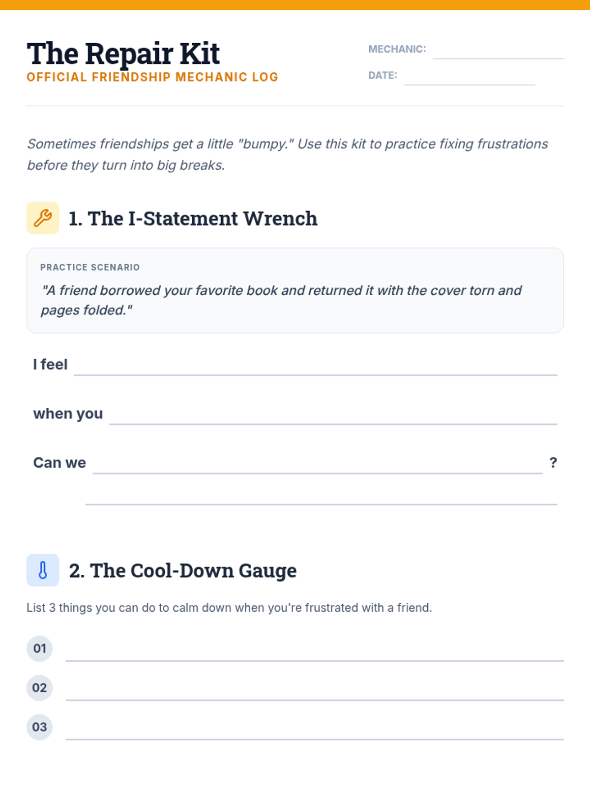 A student-facing worksheet designed as a "Repair Kit" for friendship frustrations, allowing students to practice I-statements, cool-down strategies, and compromise solutions.