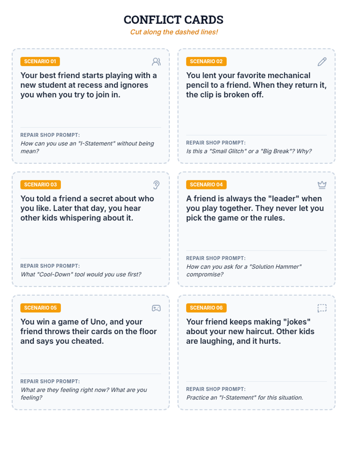 A set of six printable discussion cards featuring realistic friendship conflict scenarios for 4th graders, styled with a workshop-inspired "Repair Shop" aesthetic.
