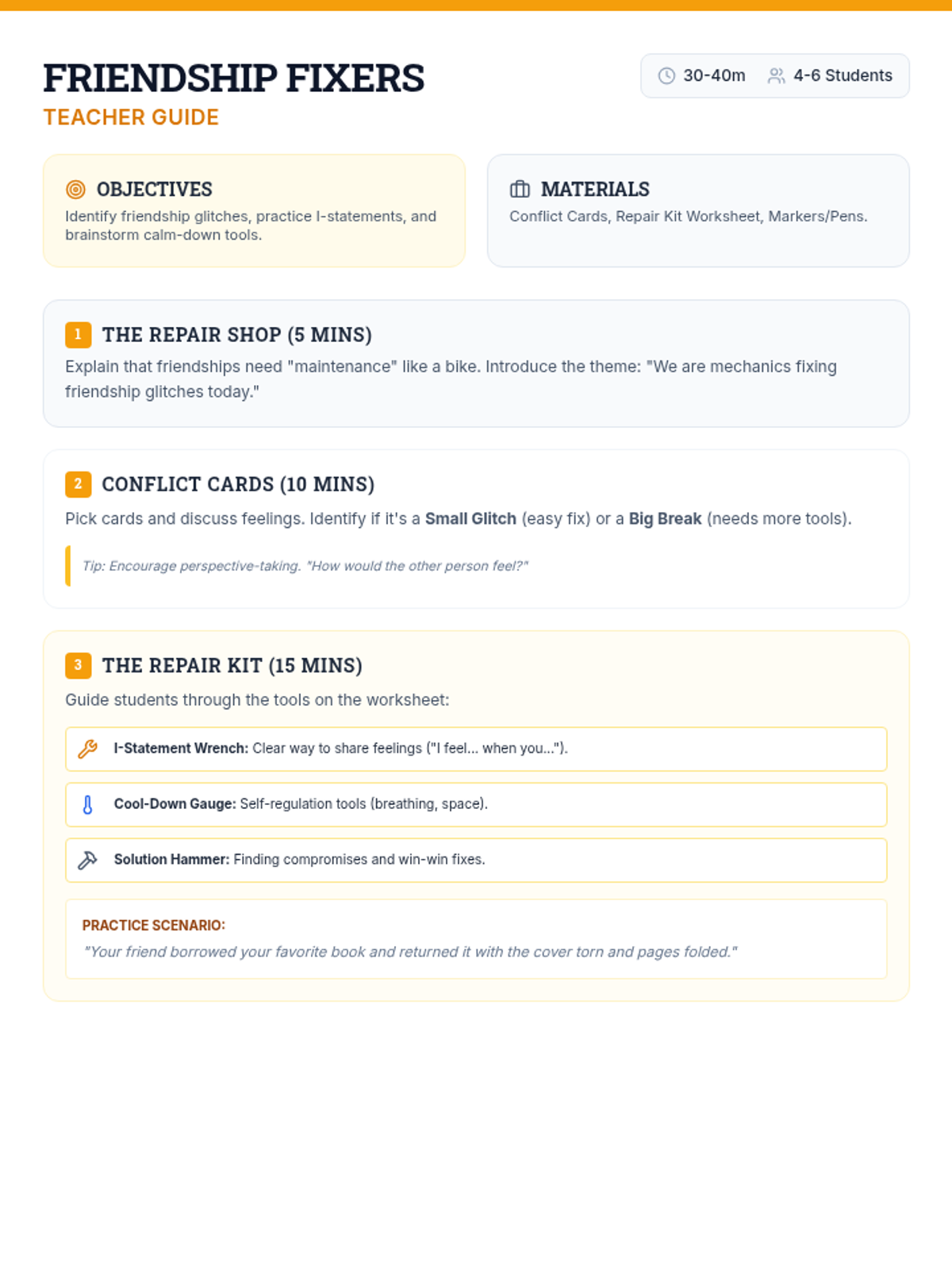 A detailed teacher guide for a 4th-grade small group lesson on friendship problem-solving, featuring an engaging "Repair Shop" theme and clear instructional steps.