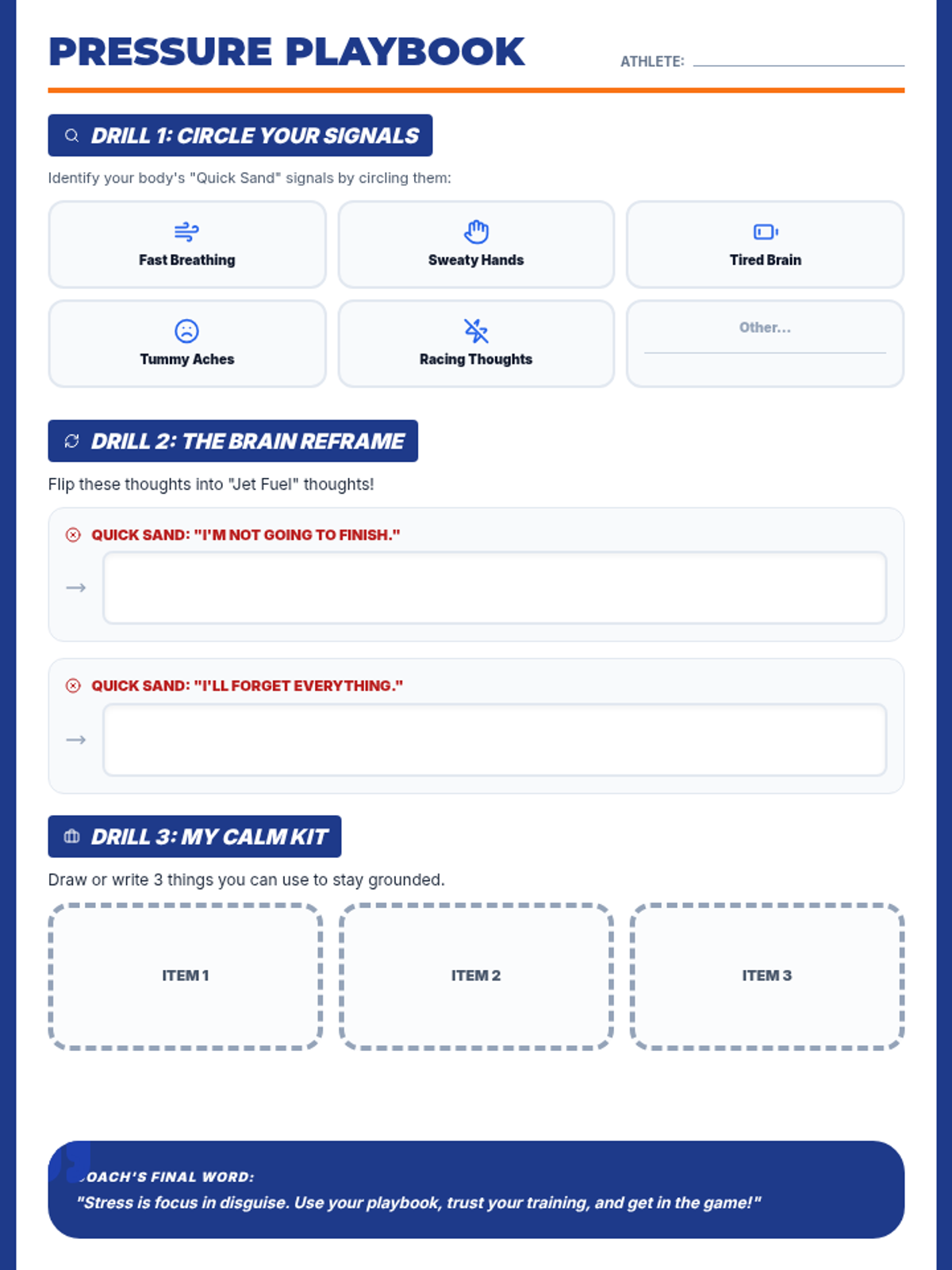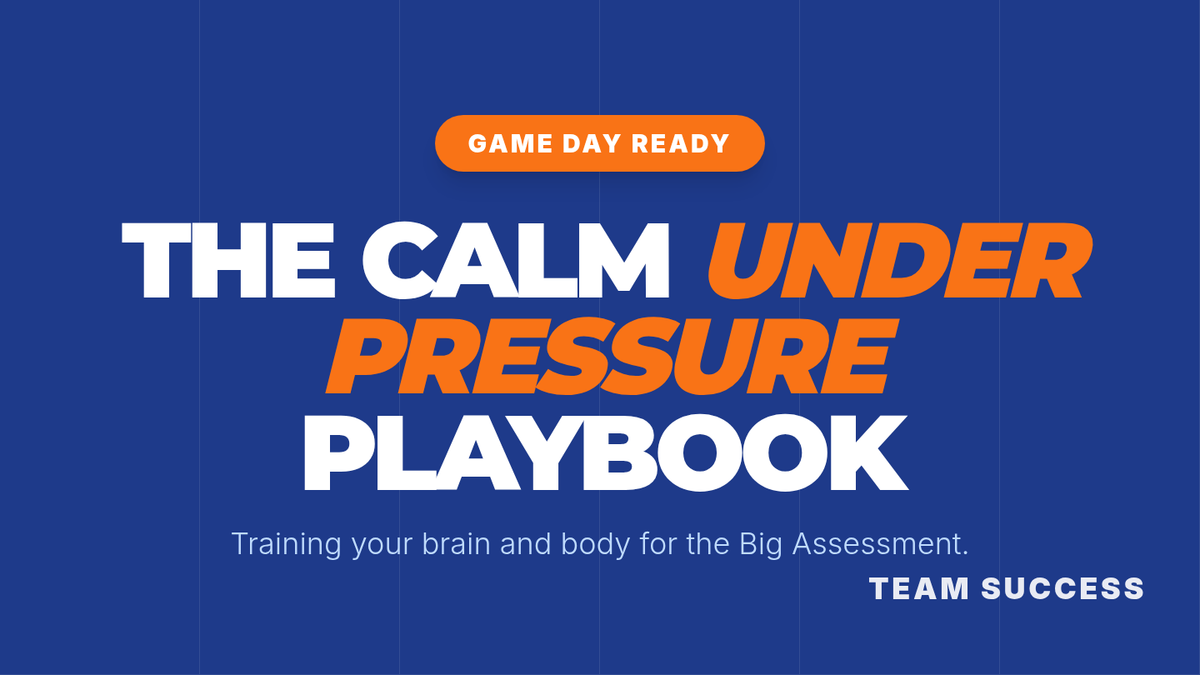 A student worksheet for 'The Calm Under Pressure Playbook' lesson where students identify their physical stress signals, practice cognitive reframing, and design their own 'Calm Kit' for test day.