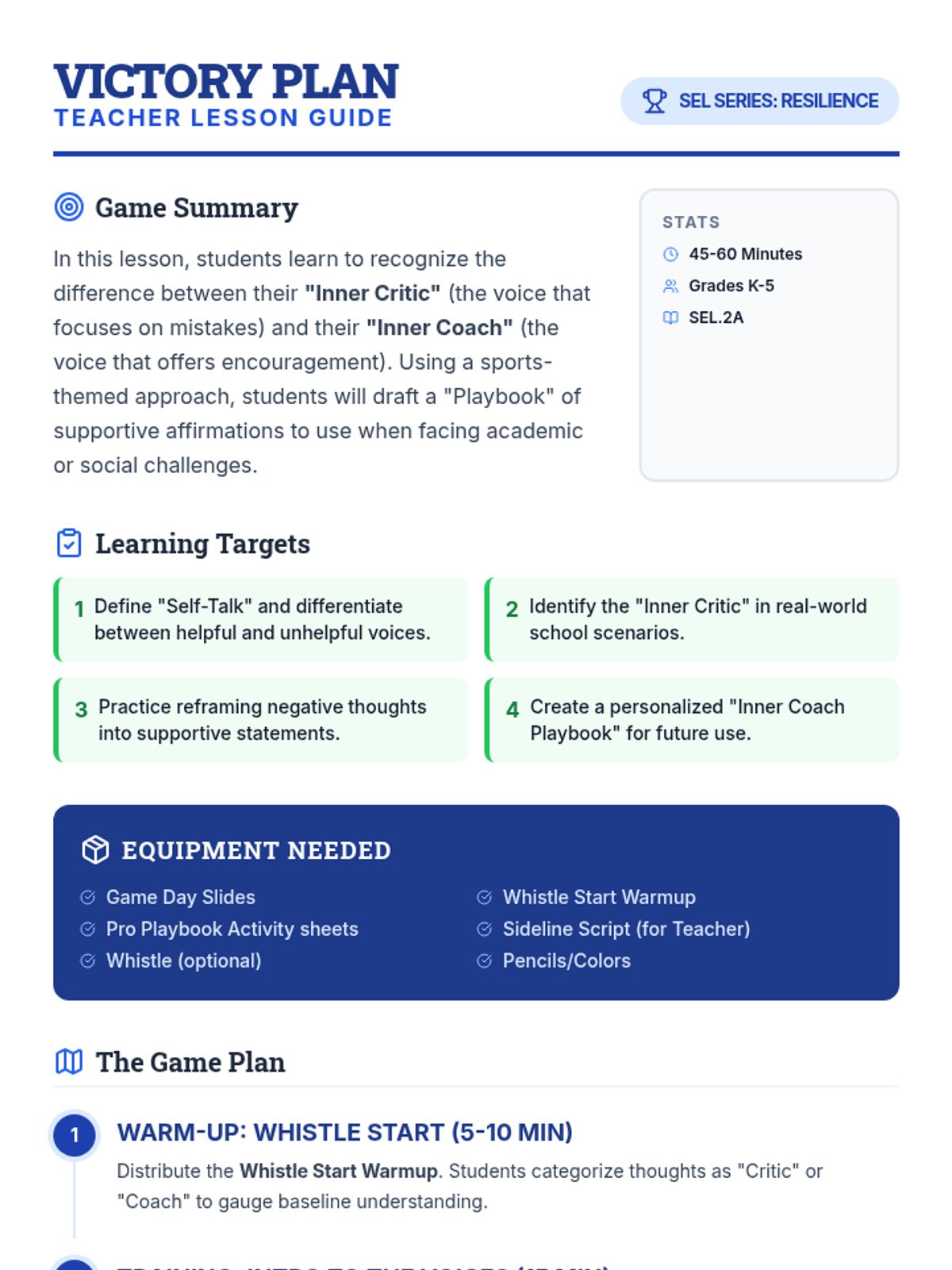 A comprehensive lesson guide for teachers, outlining the sports-themed SEL lesson on self-talk. Includes learning objectives, materials list, and a step-by-step game plan for implementation.