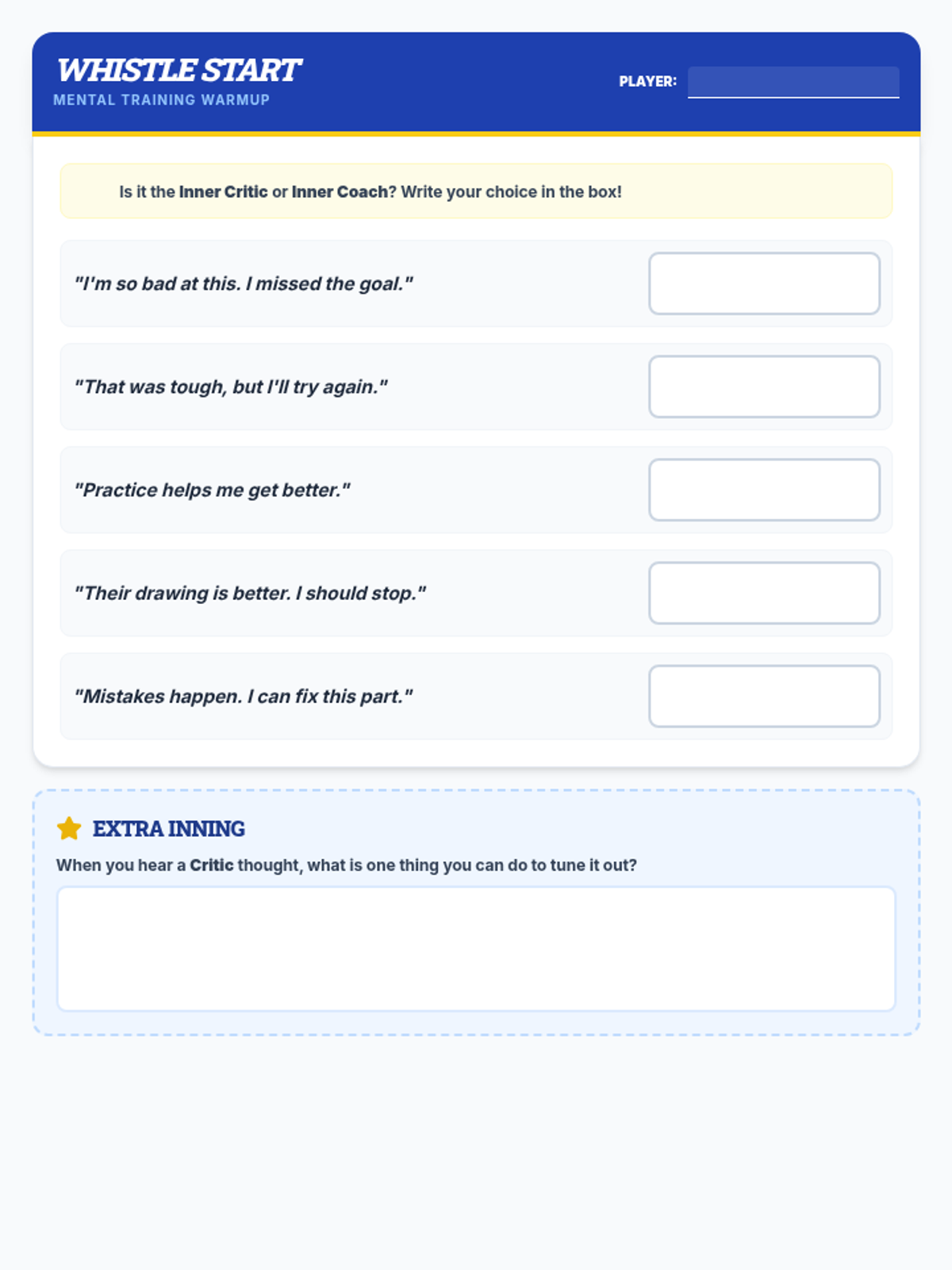 A quick warm-up activity where students categorize self-talk examples as either 'Inner Critic' or 'Inner Coach'. Designed to be completed individually before the main instruction begins.