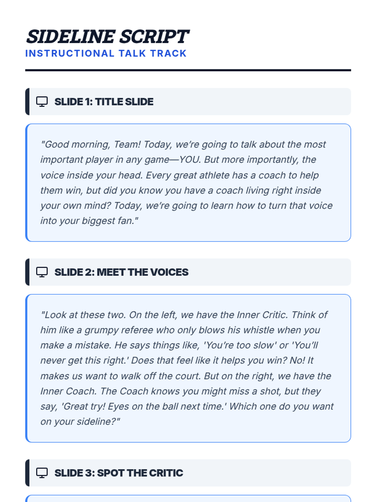 A visual slide deck introducing the concepts of the 'Inner Critic' and 'Inner Coach'. Includes interactive prompts for reframing negative thoughts and instructions for the playbook activity.